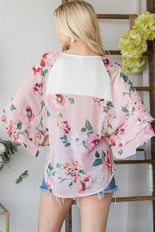 Floral Colorblock Half Sleeve Top: Ivory Pink