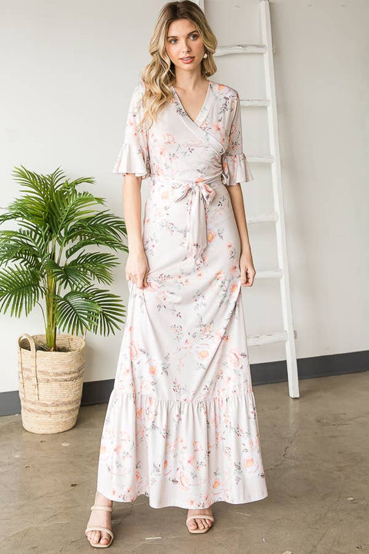 Floral Paint Short Sleeve Tie Cuff Surplice Neck Dress