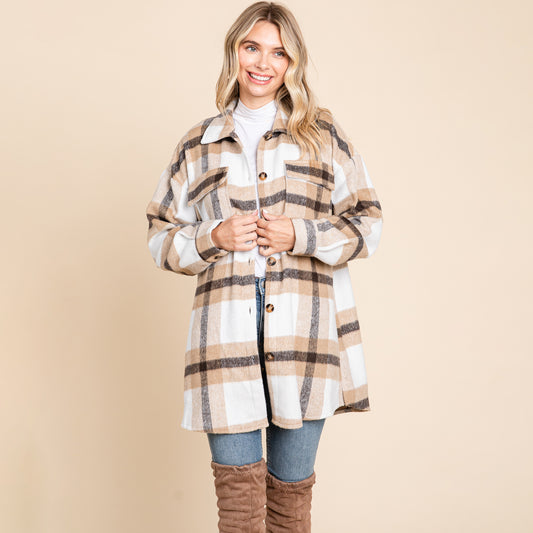 Lapel Button Up Plaid Flannel Shacket Shirt Jacket