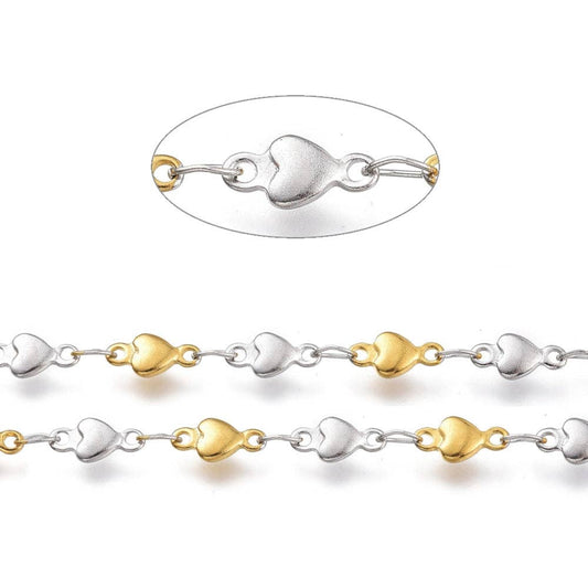 Mixed Metal Heart Link Chain By the Foot - Stainless Steel