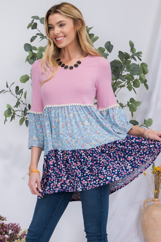 Pink Printed 3/4 Dolman Sleeve Plus Size Blouse