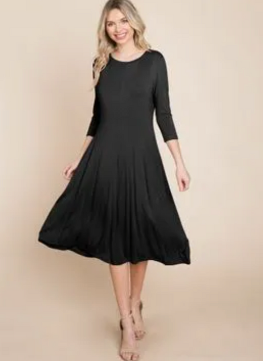 Pleated 3/4 Sleeve A line Flare Midi Jersey Dress