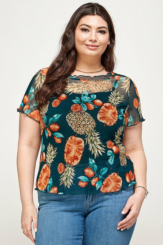 Plus Size Top Pineapple Print Mesh Tee