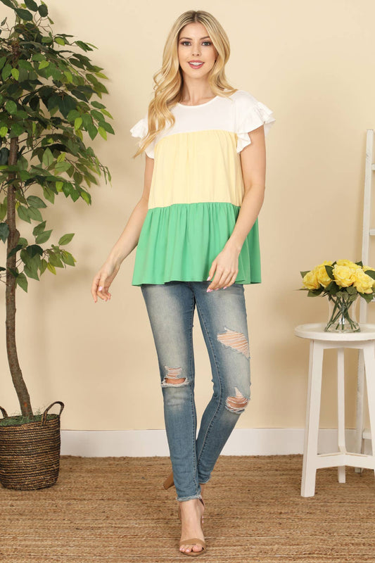 Short Ruffle Sleeve Color Block Top