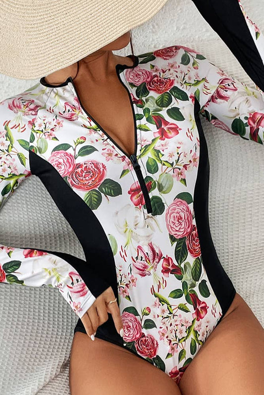 Zipper Down Floral Print Sleeves Rushguard 2pcs Set ZZKF636