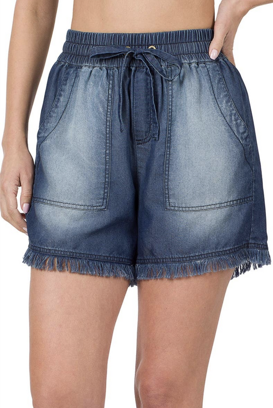 Sky Chambray Drawsstring Ruffle Waist Shorts w/Pockets