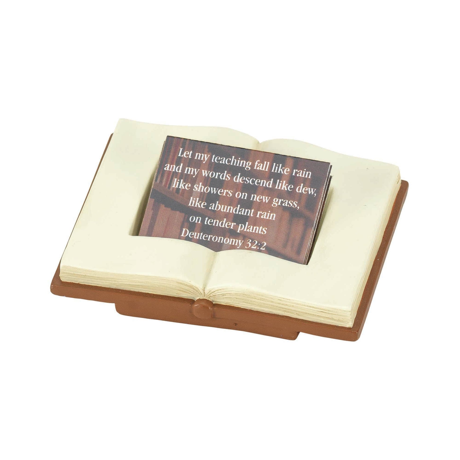 Teachers Prayer Faithbuilder Verse Cards in Book Holder. Give your favorite teacher a daily dose of inspiration from the Bible, with this set of verse cards neatly tucked into a book shaped figurine. Each 2 1/2" x 1 1/2" card has a different Bible verse on the front and back with a book shelf background. There are 20 cards and 40 verses in all. Figurine is resin; size is 3 1/4" X 1' X 2 1/4".