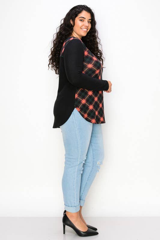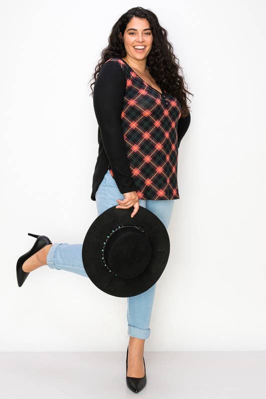 PLUS SIZE PLAID BACK DETAIL LONG SLEEVE V NECK TOP WITH BUTTON ACCENT