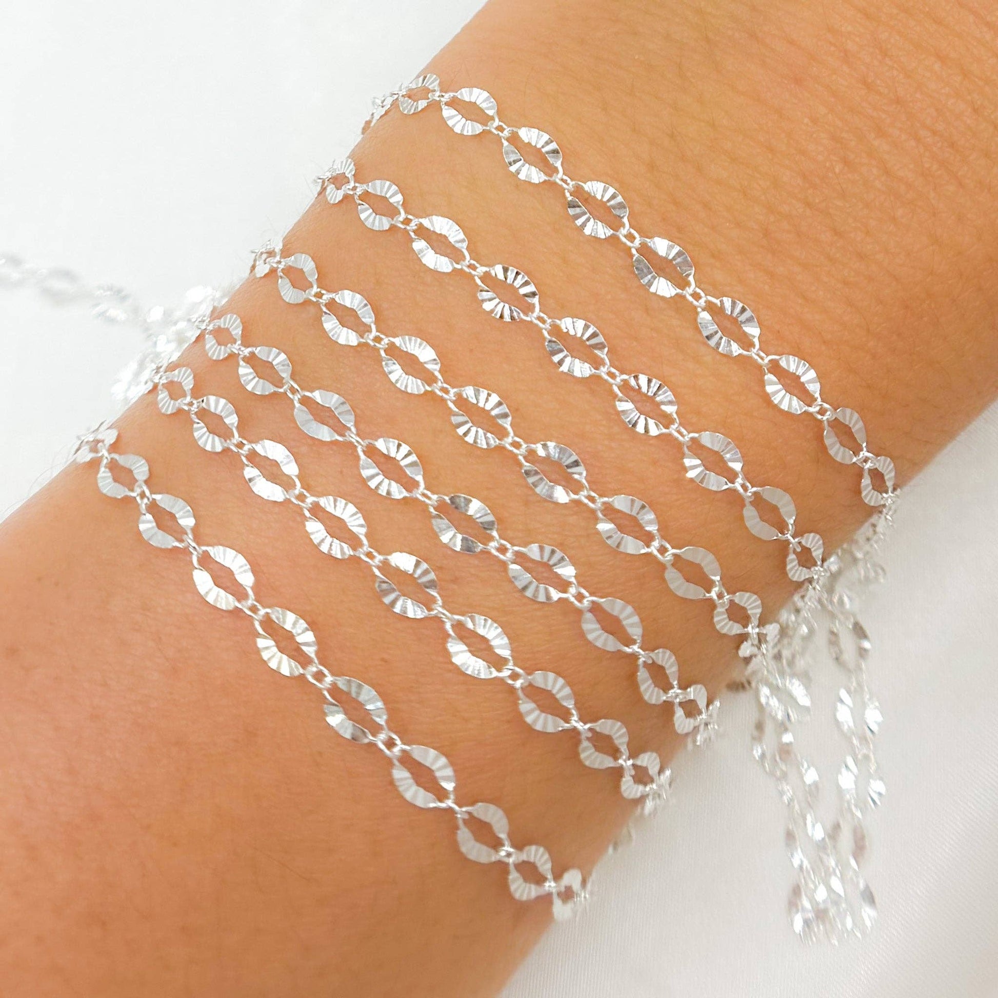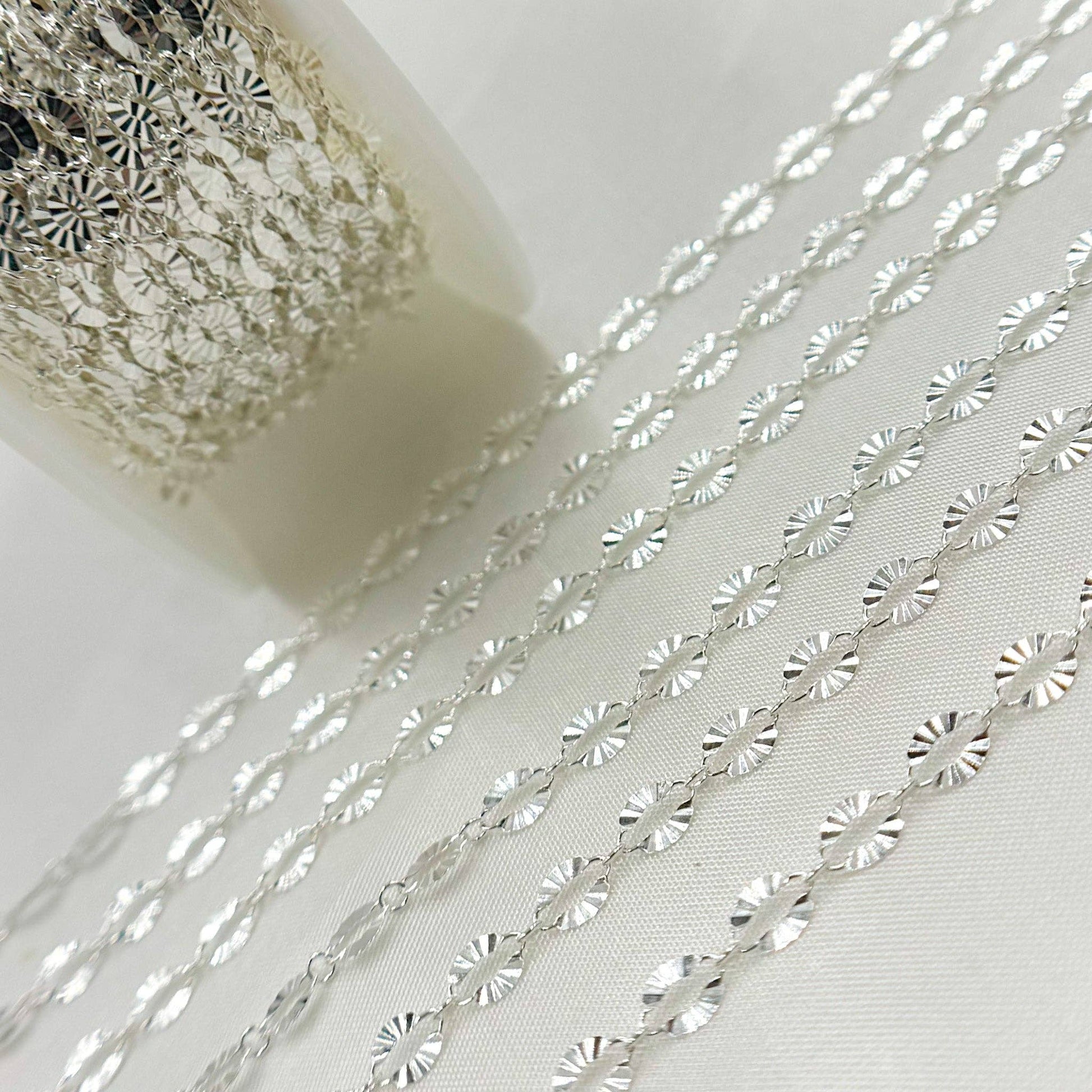 Sterling Silver Diamond Cut Marina Link Chain. Link Size: 3x5mm. Sold by Foot.