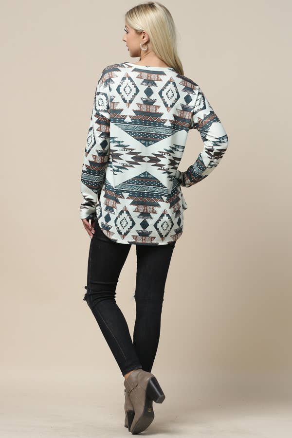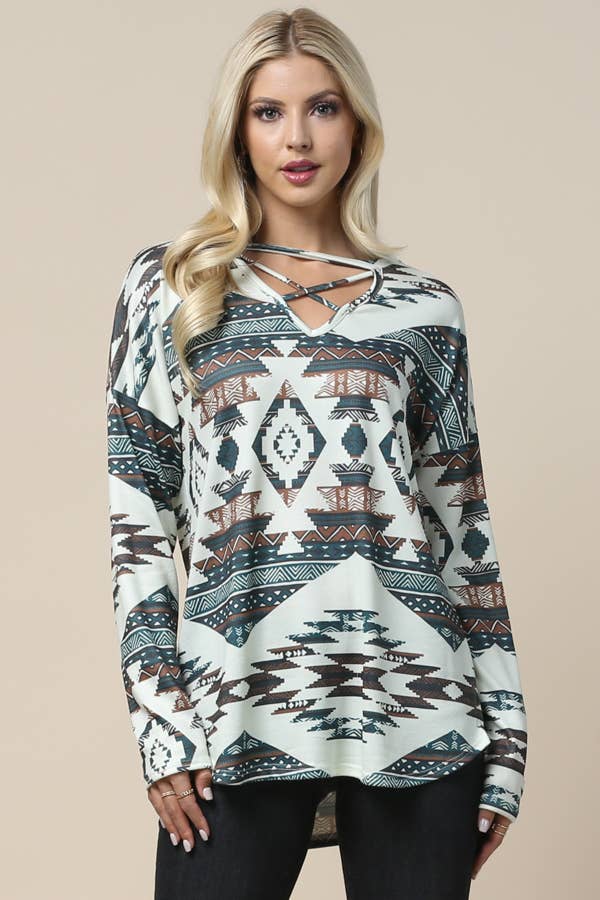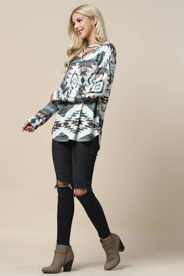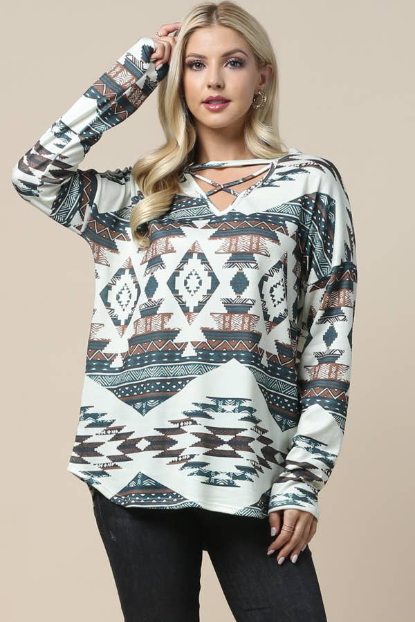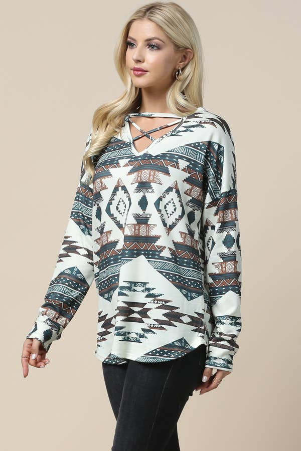 Aztec Print Cross V Neck Hacci Top - Ronnie