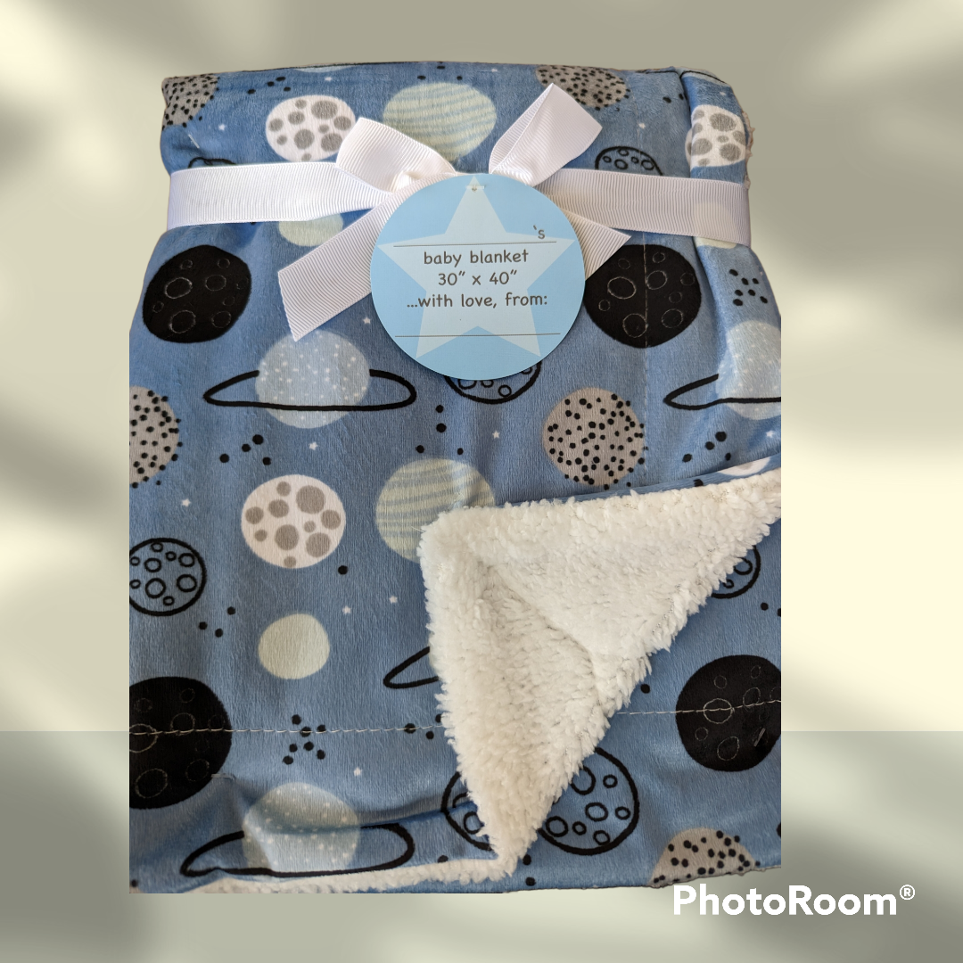 Our baby blankets are 100% soft flannel-polyester that come in unique baby and lifestyle designs. The blanket is packaged with gift card hang tag.
