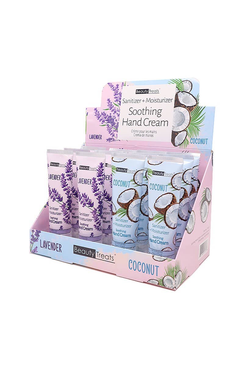 Beauty Treats 118 Lavender and Coconut Soothing & Sanitizing Hand Cream. A nourishing cream formulated to sanitize and moisturize dry hands. Leaves skin soft, smooth and nourished. Available in 2 scents lavender and coconut, 6 pcs of each. Made in Taiwan. 12 pcs in display.