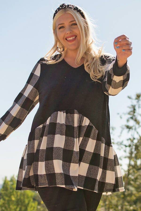 Plus Size Cute and Casual Buffalo Plaid Babydoll Tunic top with V Neck and Cuff Detail