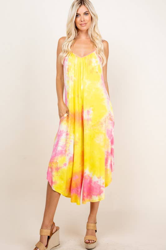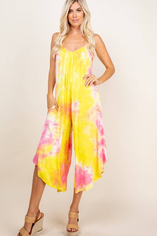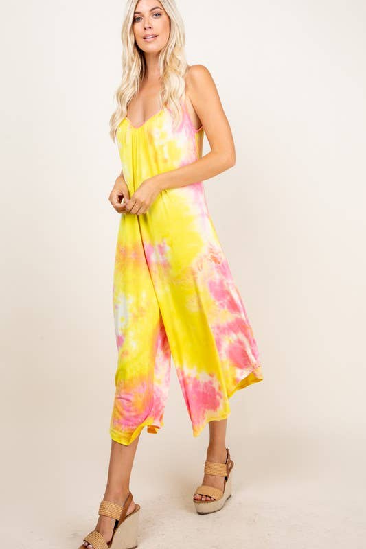 Ready to turn heads and radiate sunshine? This vibrant tie-dye jumpsuit is what summer dreams are made of! With a relaxed, flowy fit and adjustable bra-style straps, it’s all about comfort and color. The cropped wide-leg design keeps it breezy, while the bold yellow and pink swirls add a splash of playful personality.