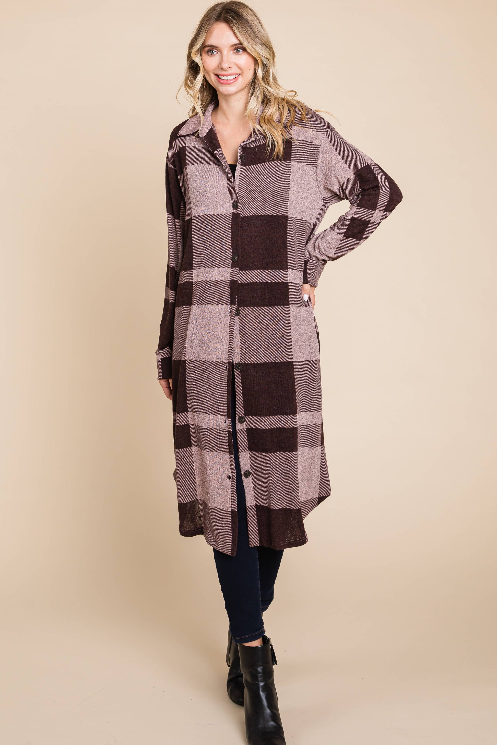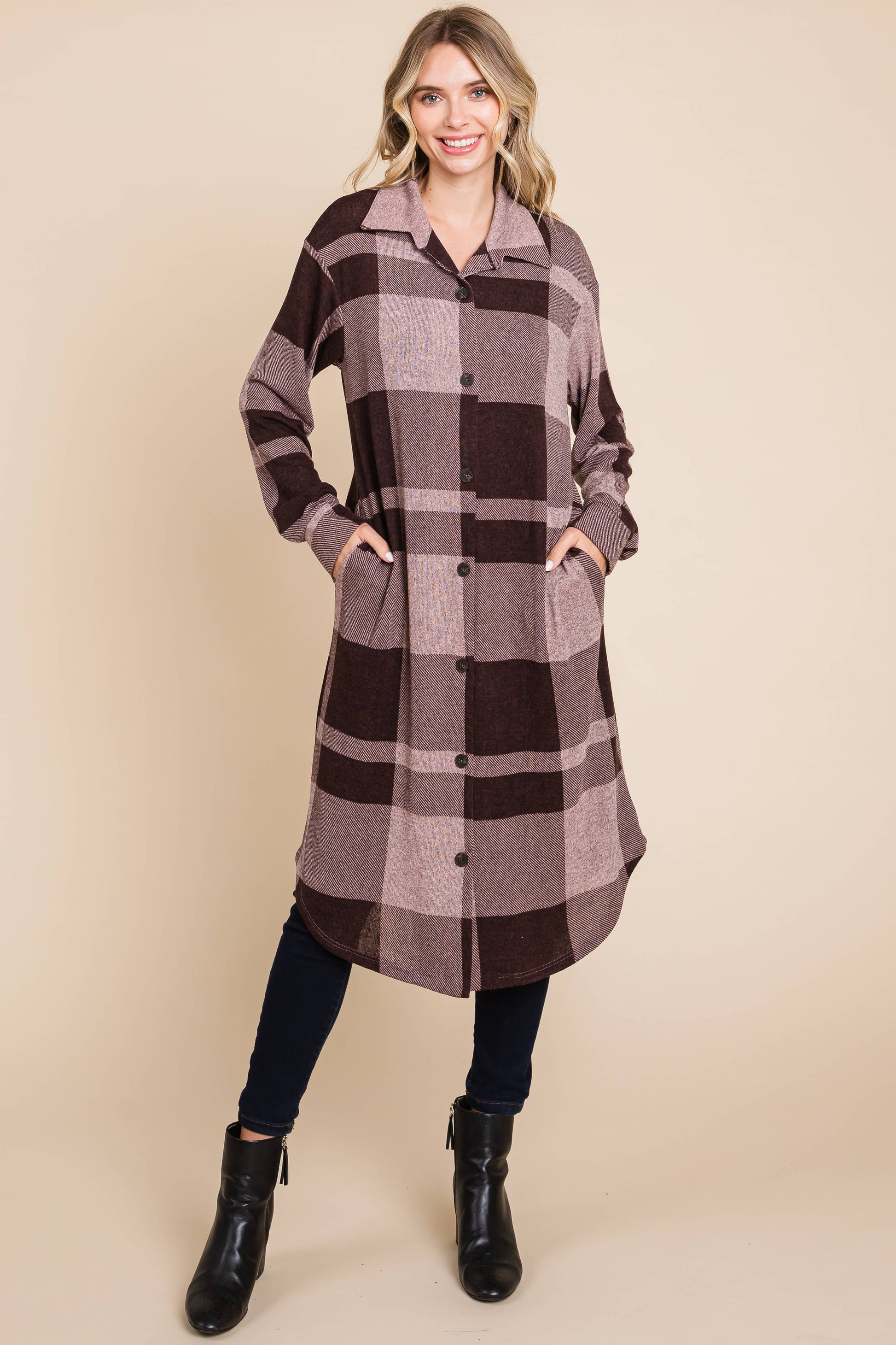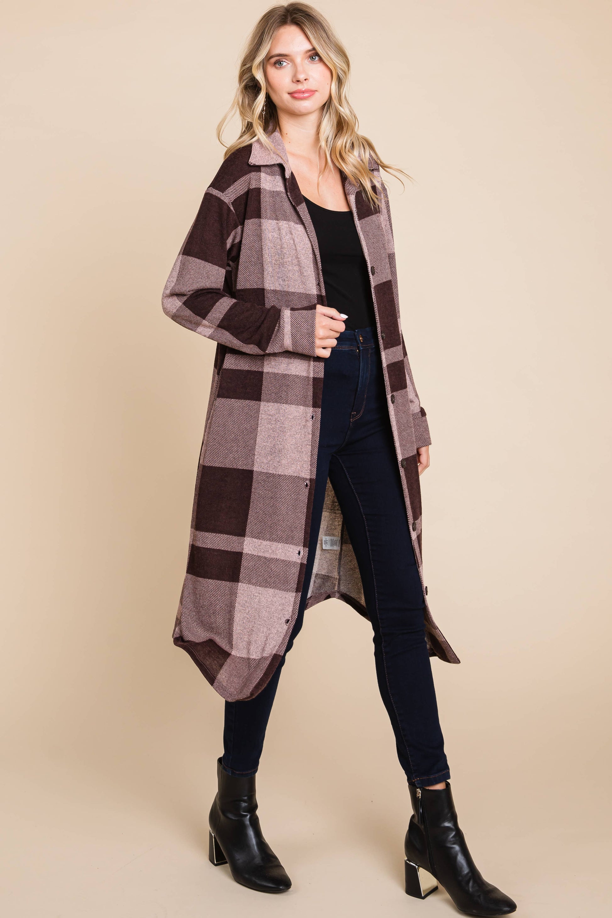 Buffalo Plaid Pattern Long Shacket with Basic Collar, Button Down Front, Side Pockets, Dropped Shoulders, Long Sleeves, and Buttoned Cuffs