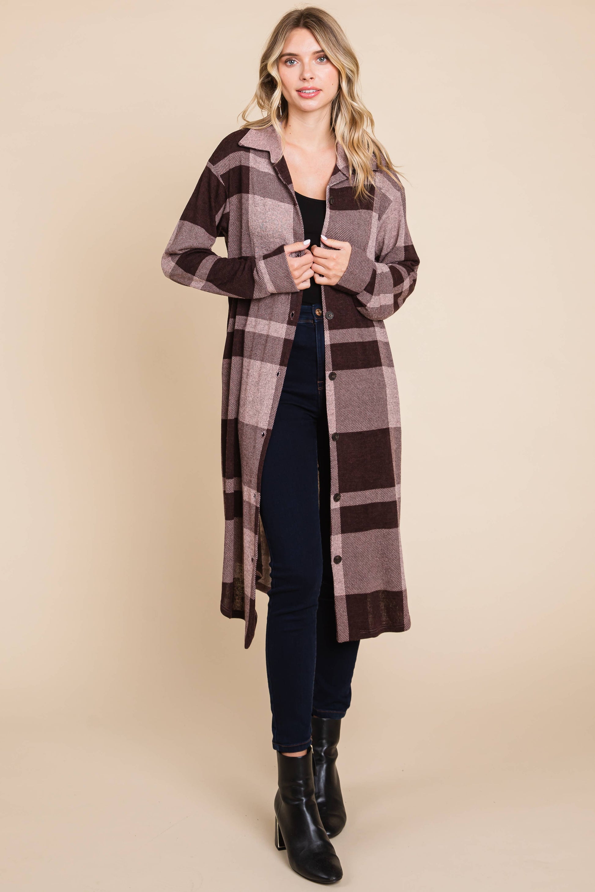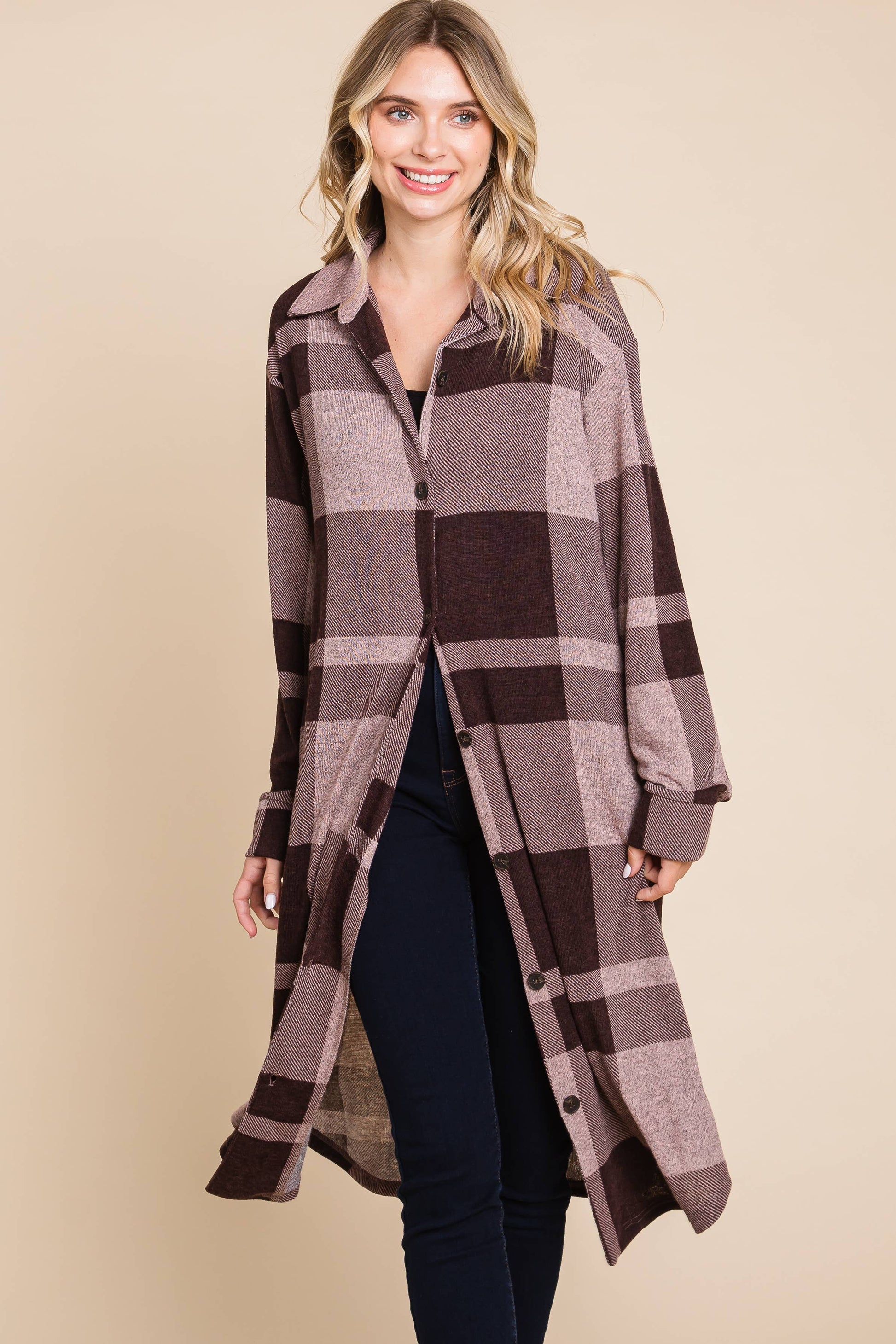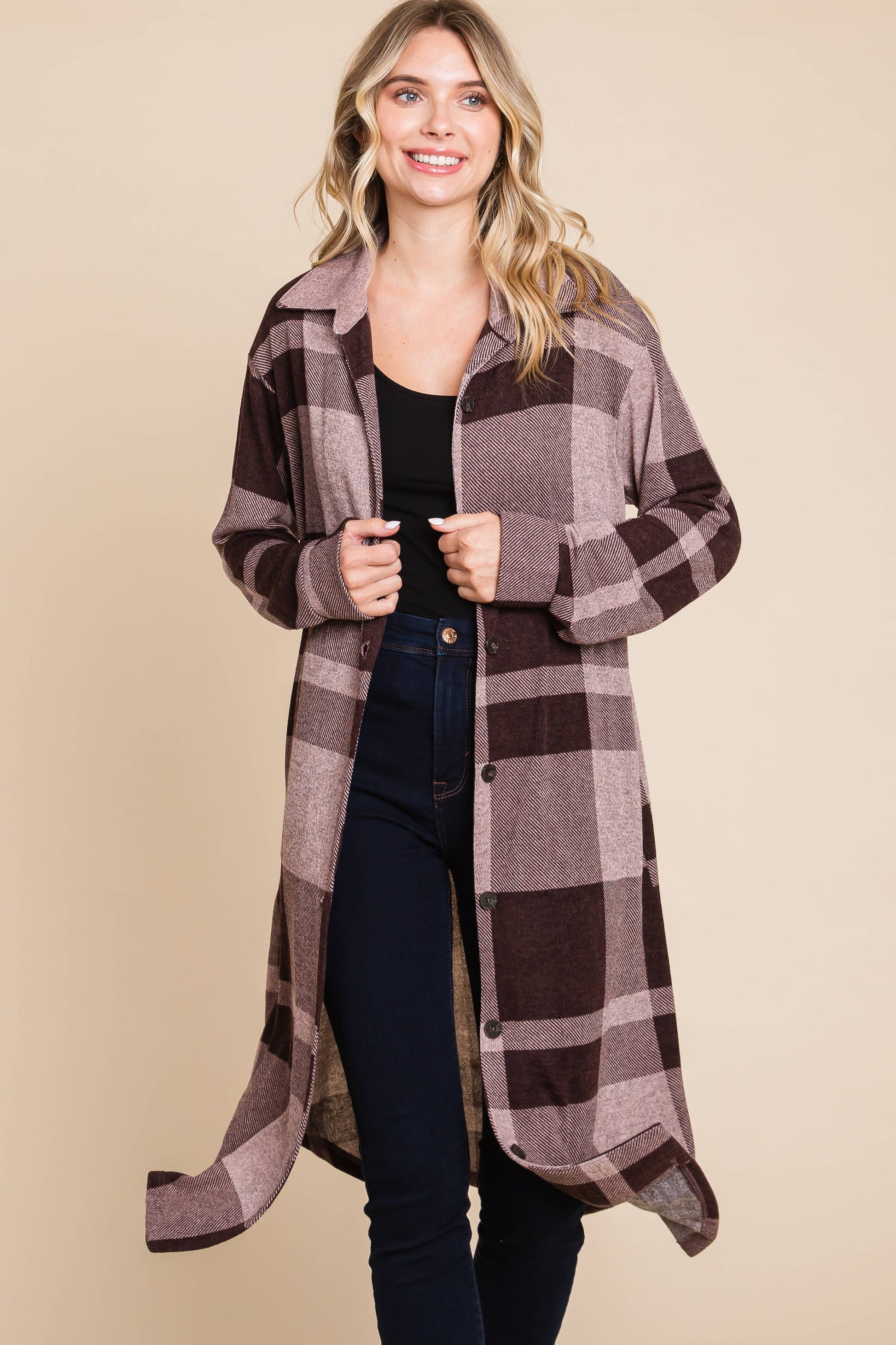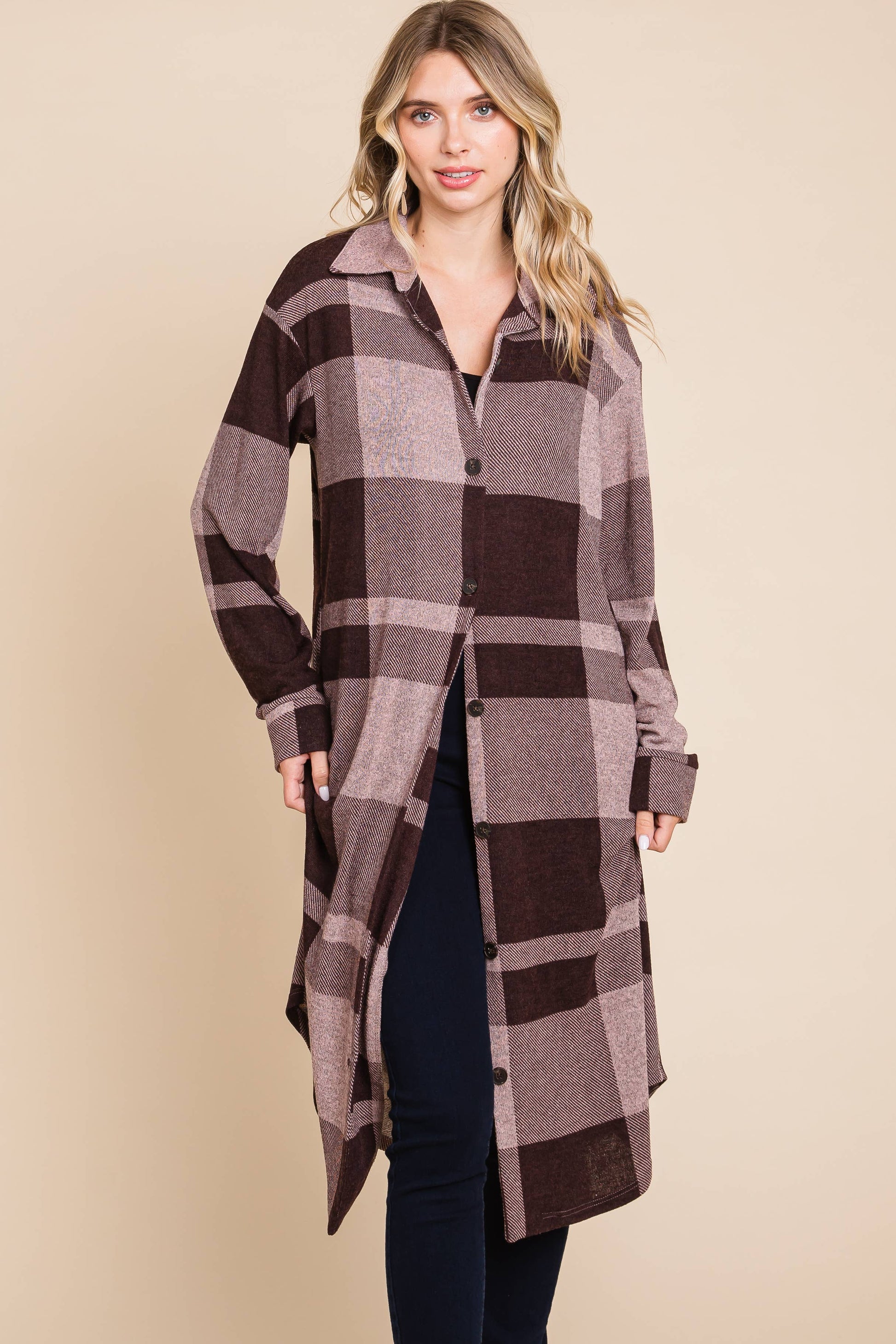 Buffalo Plaid Pattern Long Shacket with Basic Collar, Button Down Front, Side Pockets, Dropped Shoulders, Long Sleeves, and Buttoned Cuffs