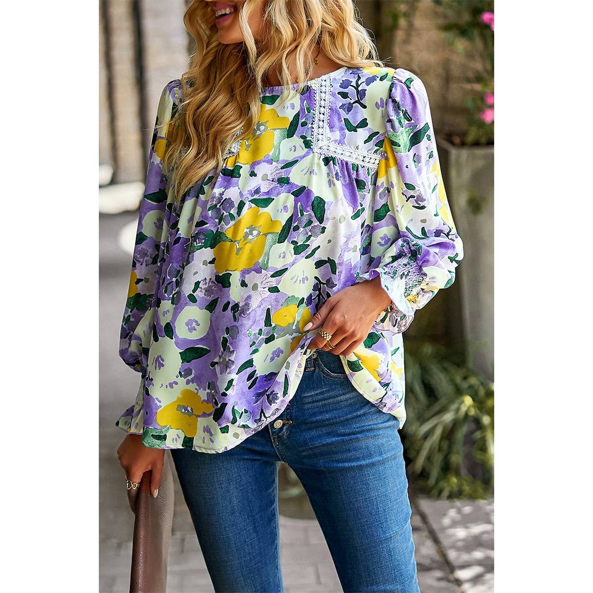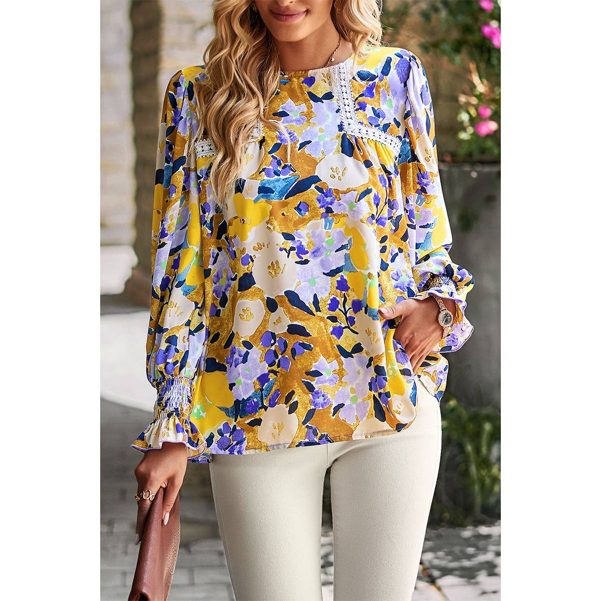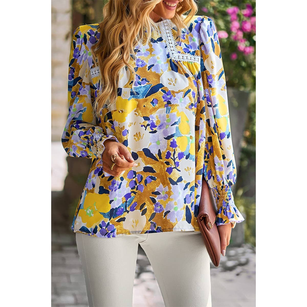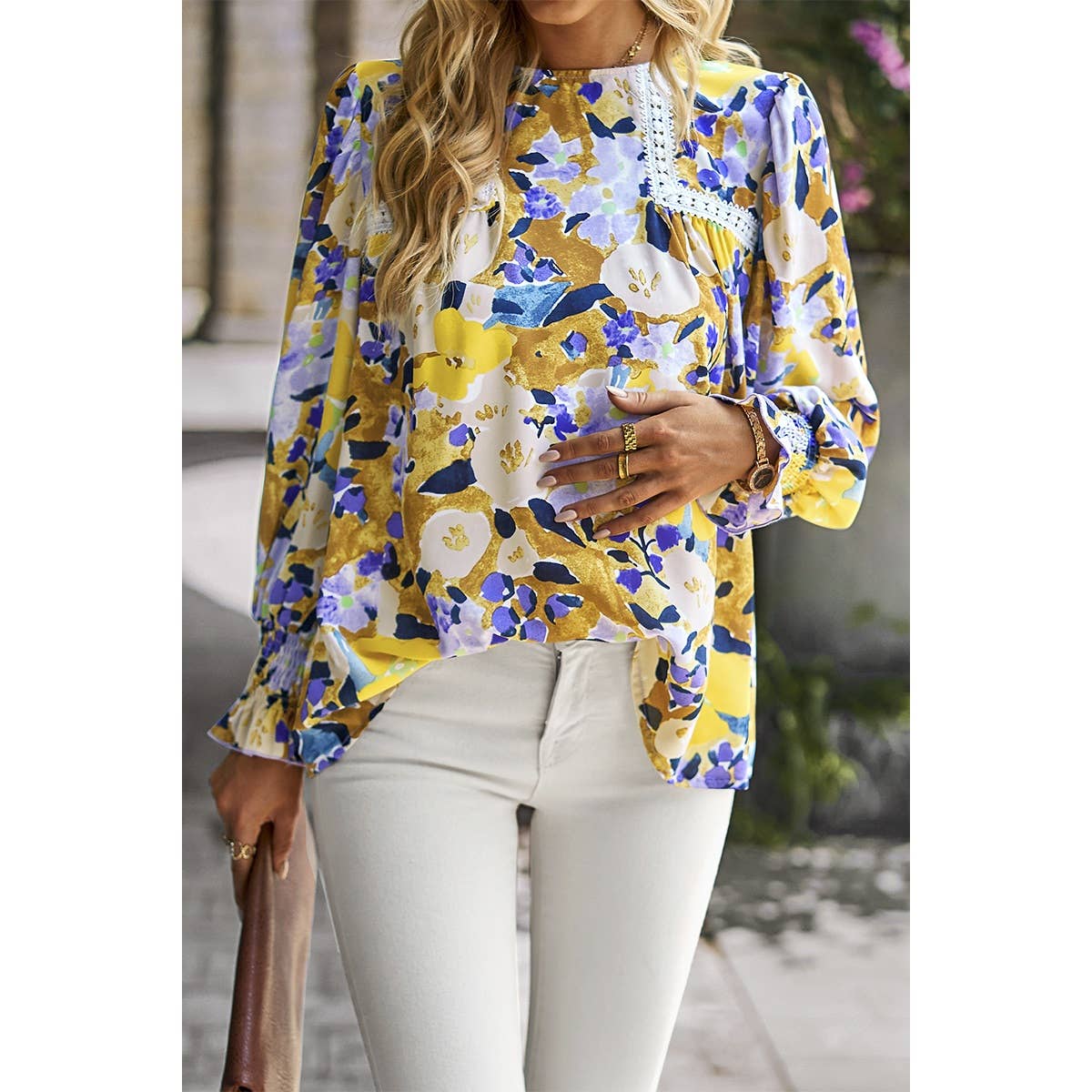 Brighten up your wardrobe with this stunning floral top featuring a playful mix of vibrant yellow, periwinkle, and soft lavender hues. The lightweight fabric flows effortlessly while the contrast lace trim adds just the right touch of charm. With a flattering relaxed fit, gathered cuffs, and a split hem detail, it’s a versatile piece perfect for dressing up or keeping casual. Pair it with denim or dress pants for an easy-breezy look that feels as good as it looks!