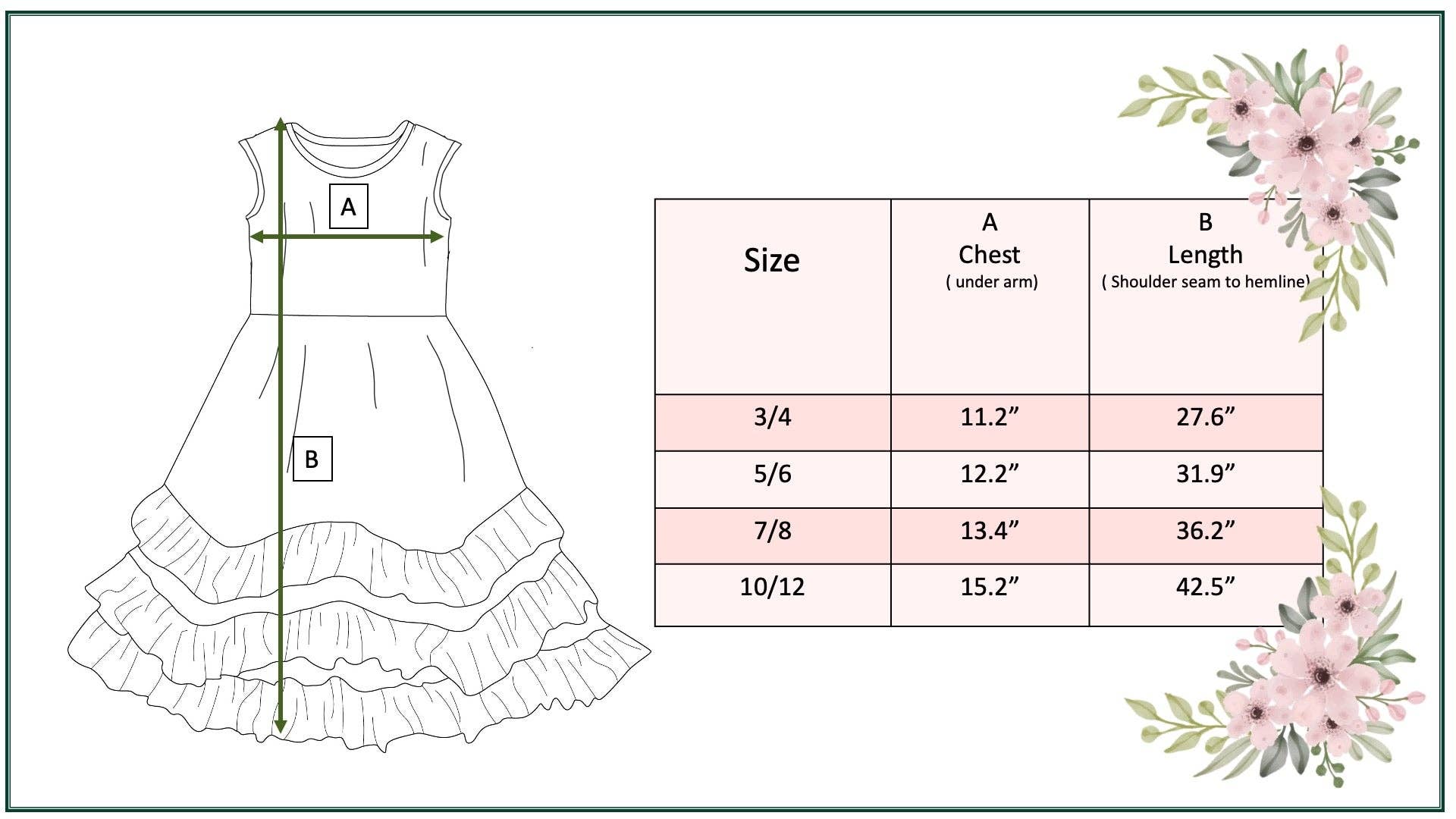 Girls tropical green and pink floral print sleeveless dress with triple ruffle hem detail. Fabric is very soft and comfy with lots of stretch. Perfect for Spring and Summer!