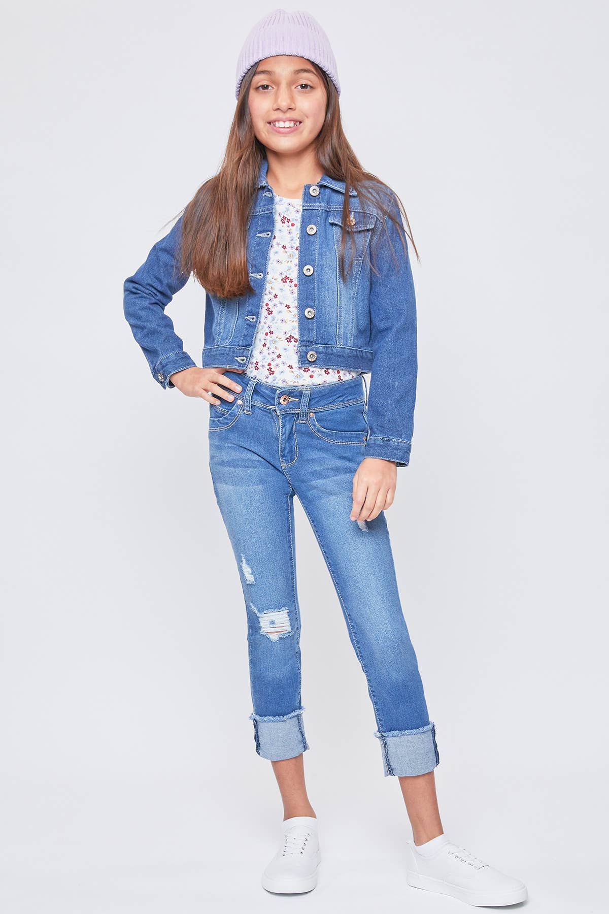 Our Girls WannaBettaFit Mid-Rise 1-Button Mega Cuff Skinny Jean Made w/Recycled Fibers is made with our signature WBF heart-shaped stitching & uniquely crafted pockets for the best fit ever! Designed with super stretchy denim for movement and all-day wear.