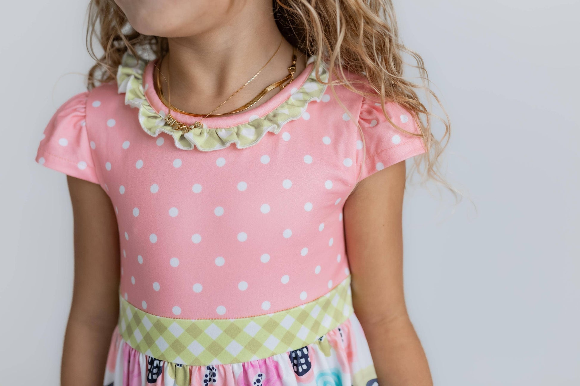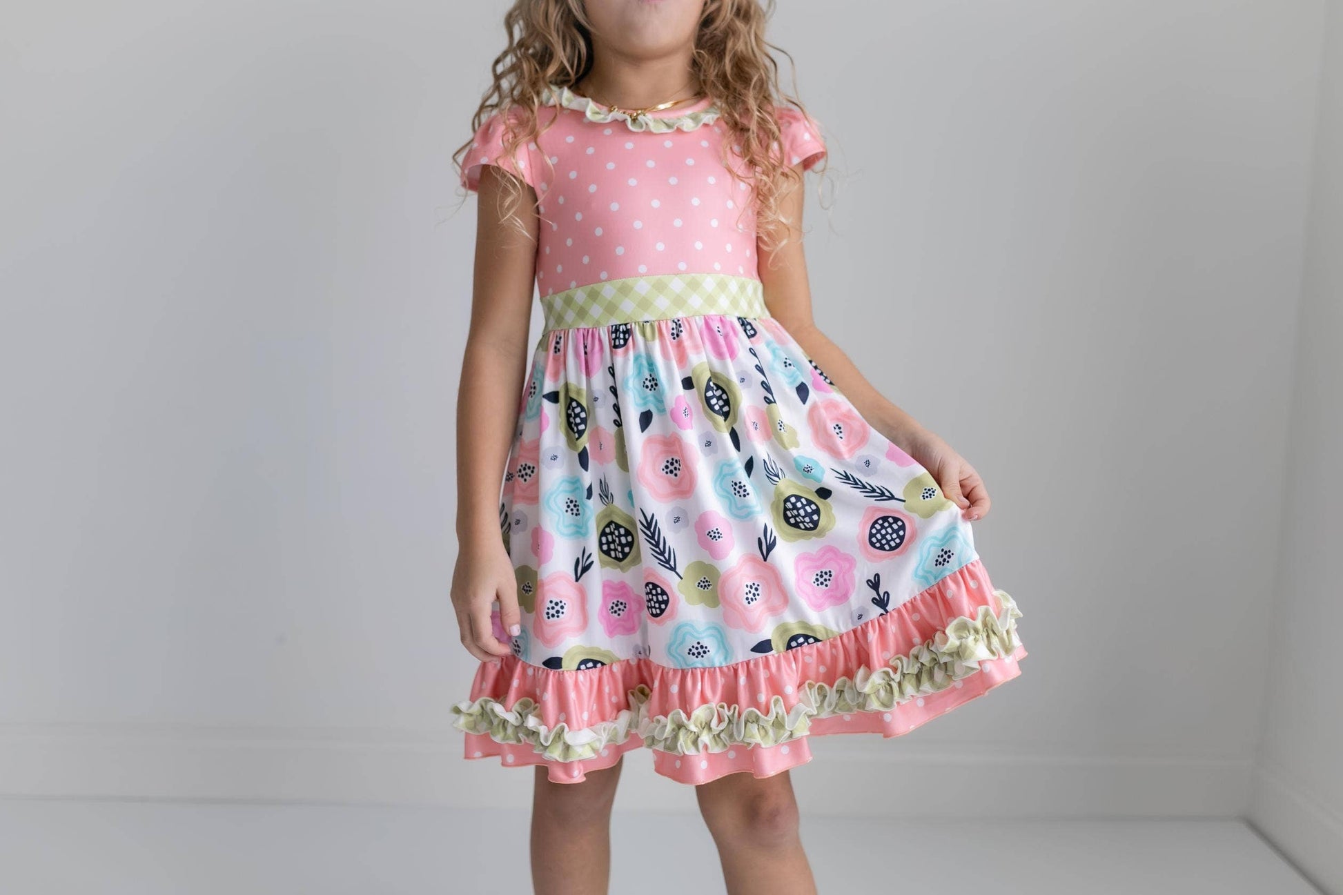 Girls peach, green, pink, blue floral print, polka dot, and gingham check print dress. Cap sleeve with keyhole back detail. Lots of ruffles for twirling on spring & summer days!