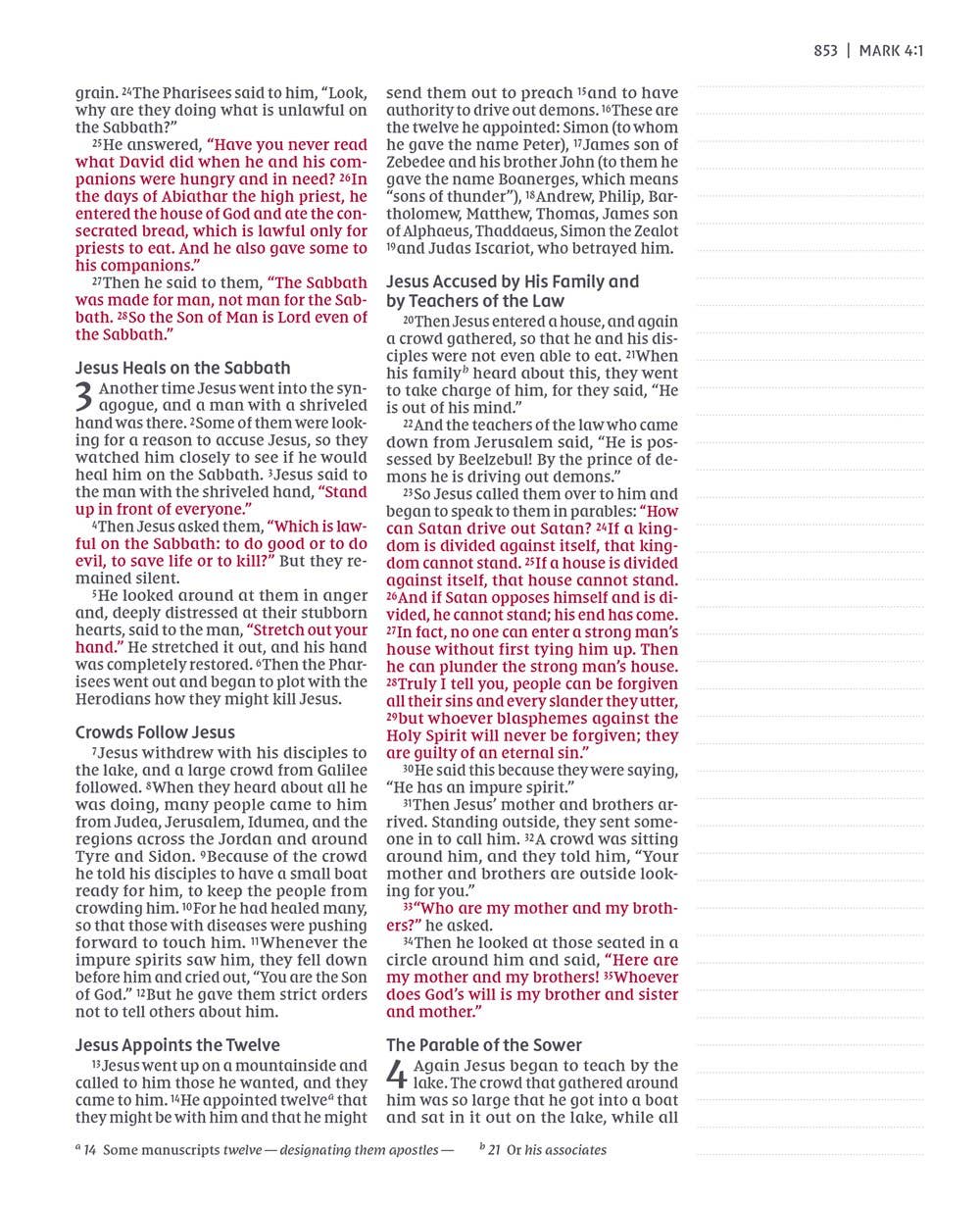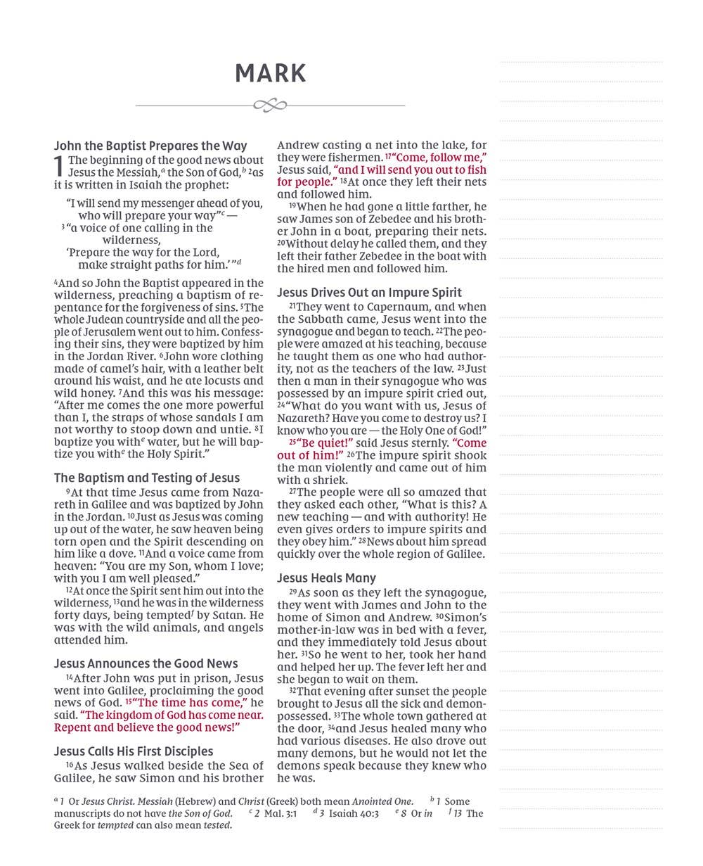 The NIV Journal the Word® Bible, Double Column allows you to creatively express yourself every day with room for notes or verse art next to your favorite verses. This double-column journaling Bible features thick cream-colored paper with lightly ruled lines in the extra-wide margins, perfect to reflect on God’s Word and enhance your study.