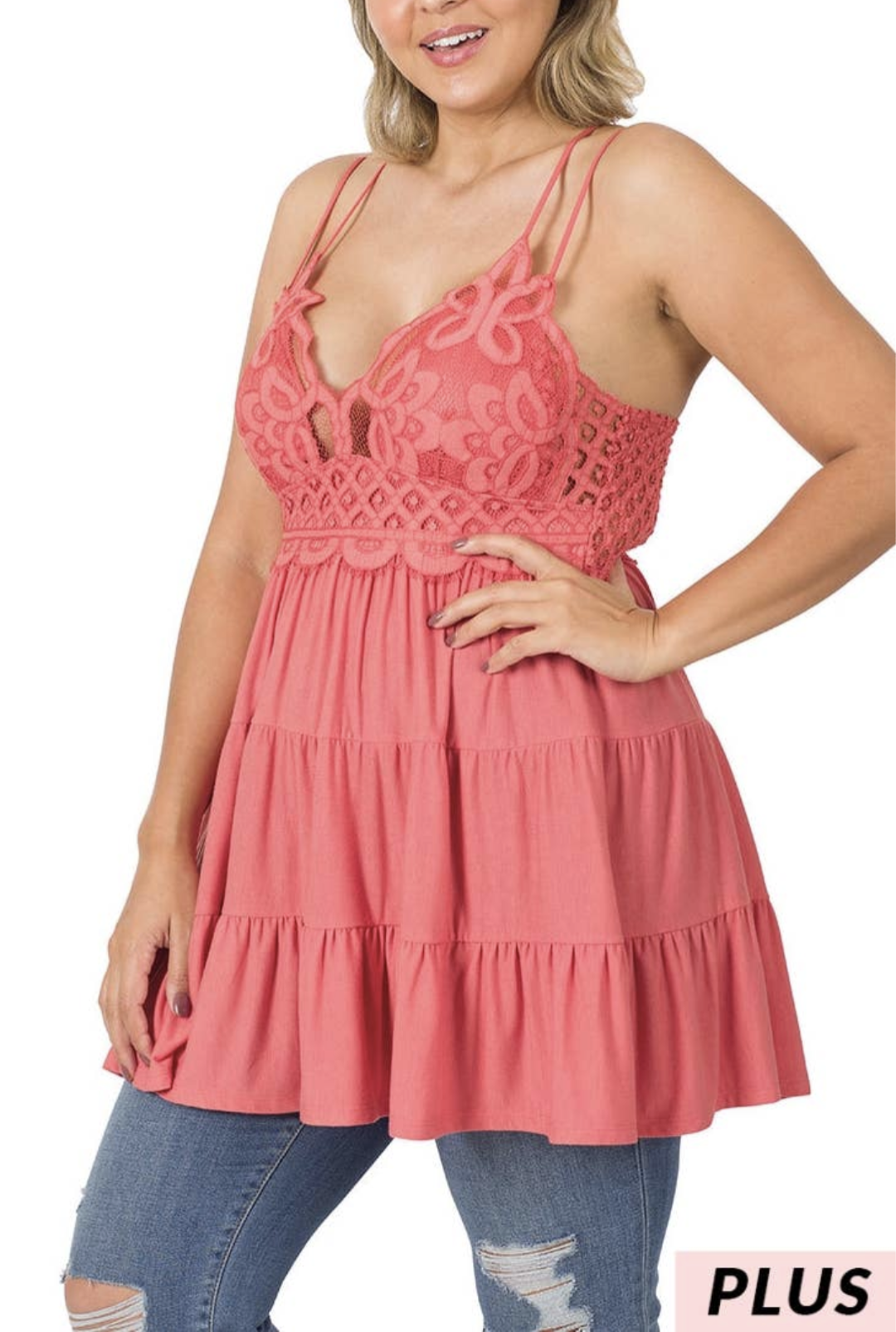 Plus Crochet Lace Ruffle Cami - Removable Bra Pads - Adjustable Strap With Crisscross Detail At Back