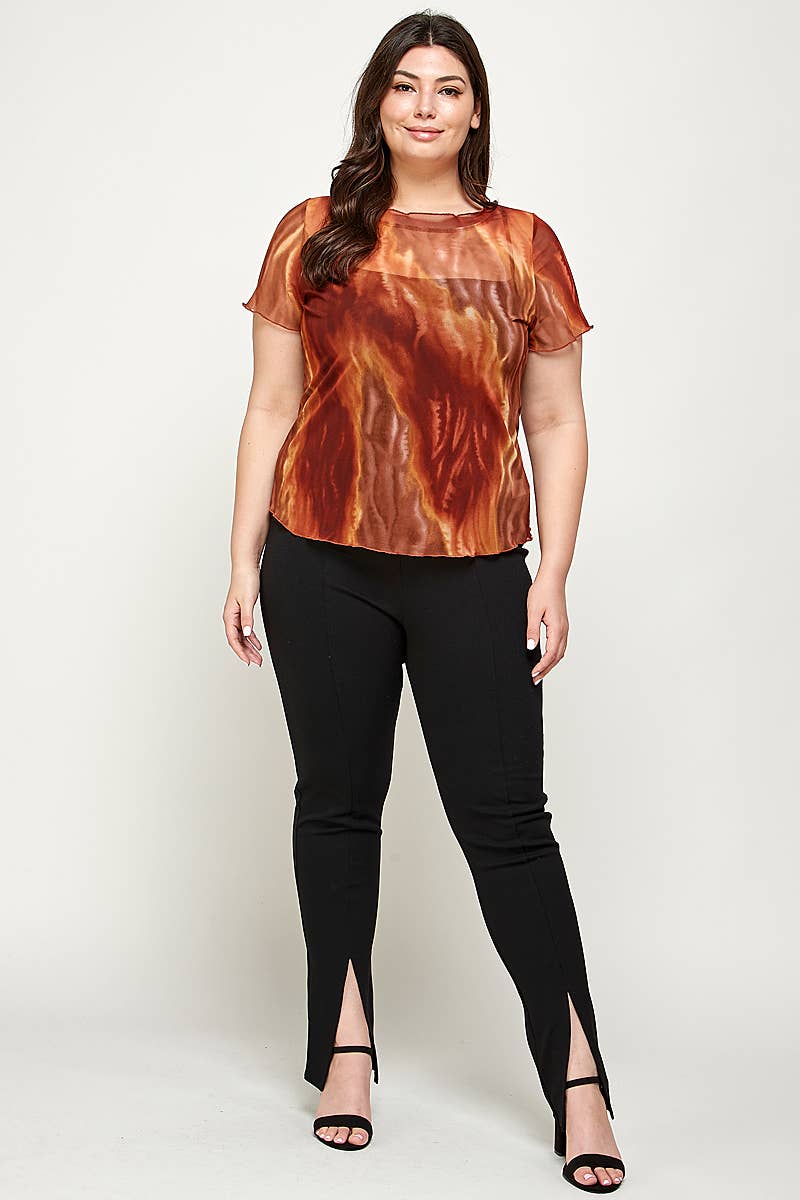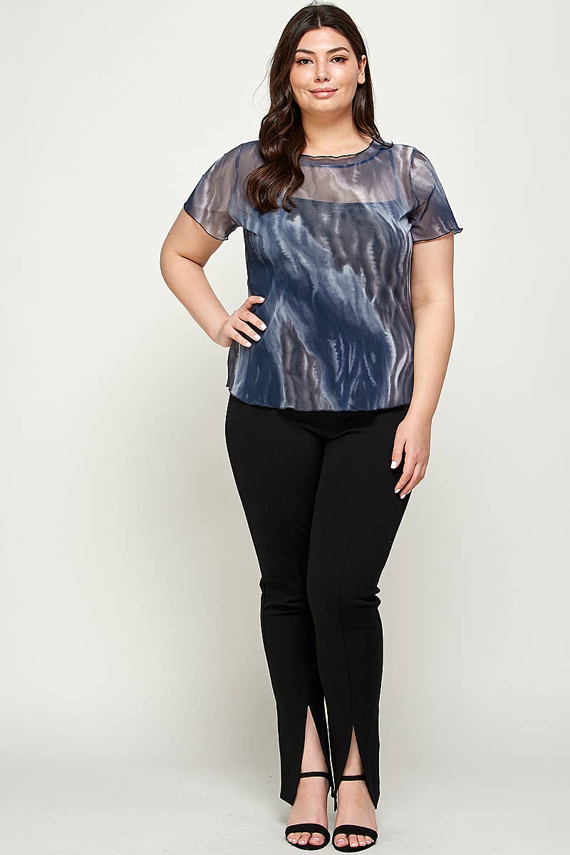 Plus size, marble tie dye print mesh top, with a round neck, short cap sleeves, hip length bodice, and a relaxed fit silhouette, by Haute Fox (Under cami not included)