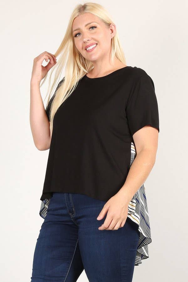 Plus size short sleeve Hi Low Hem Solid Top with Lower Back Contrast by Haute Fox.