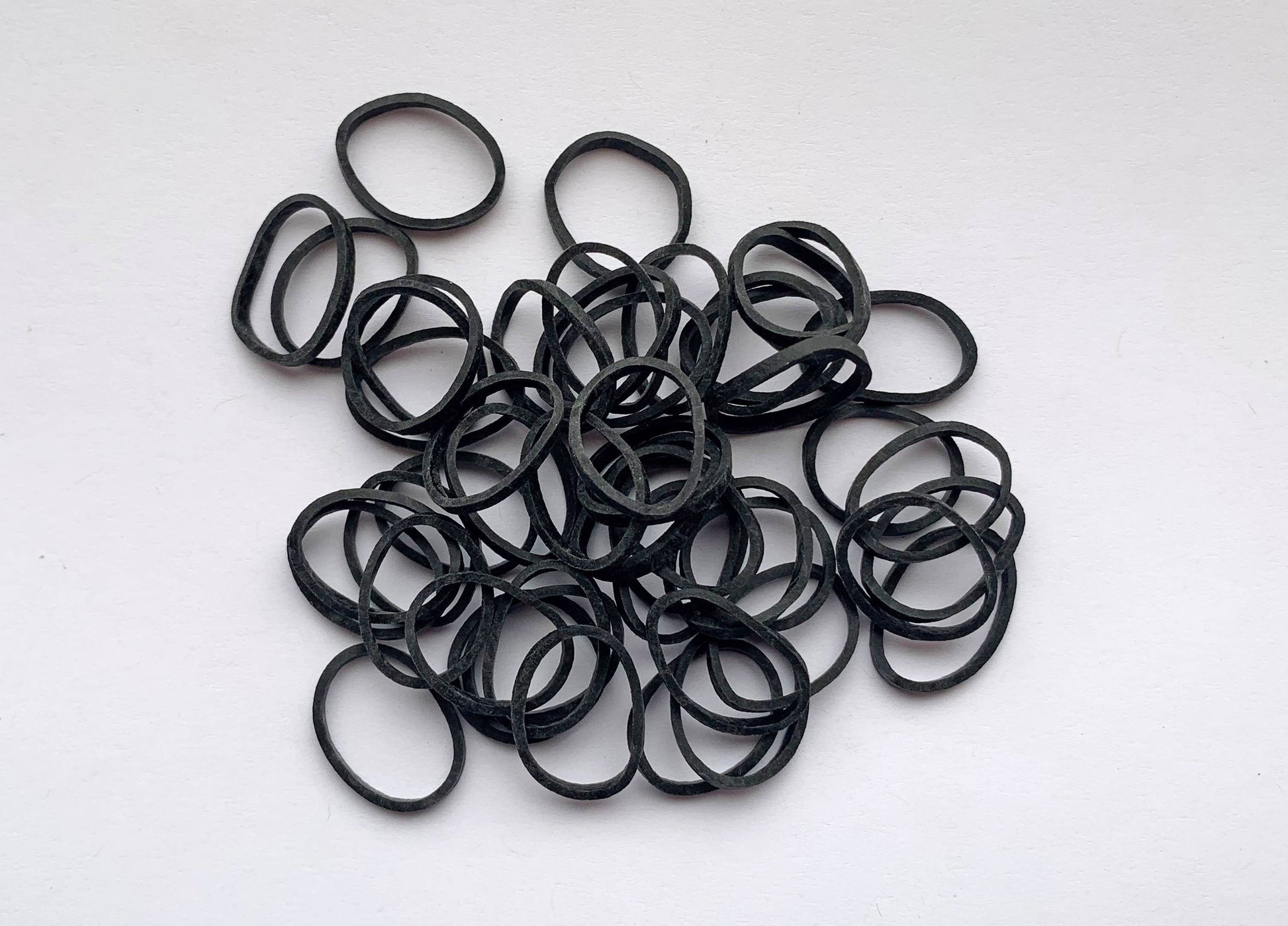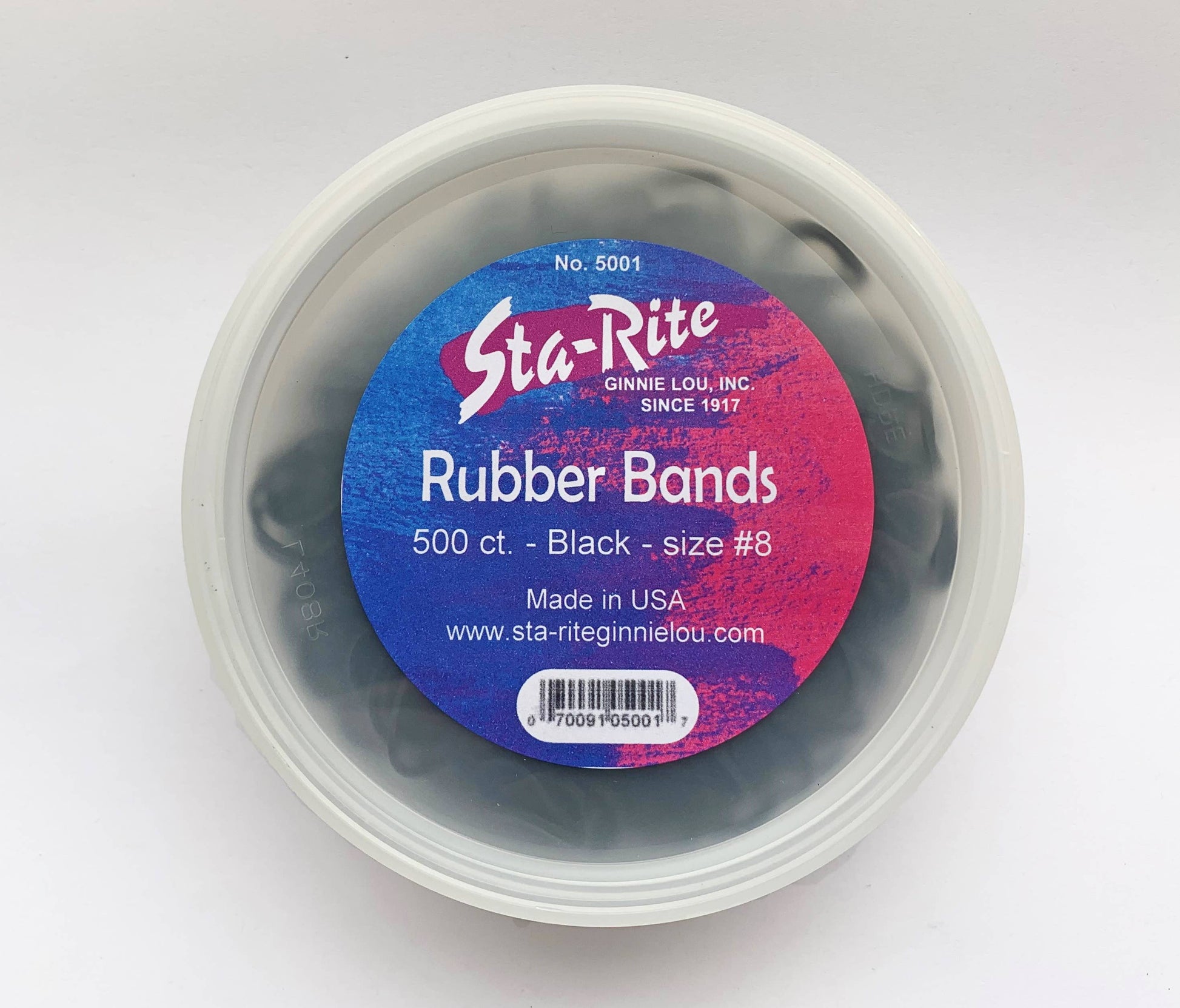 Assorted size rubber bands, 500 per jug. Available in assorted colors (assorted size), black (2 cm), and brown (2 cm). Made in the USA.