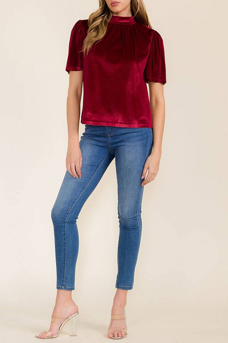 SOLID VELVET MOCK NECK SHORT SLEEVE BLOUSE TOP