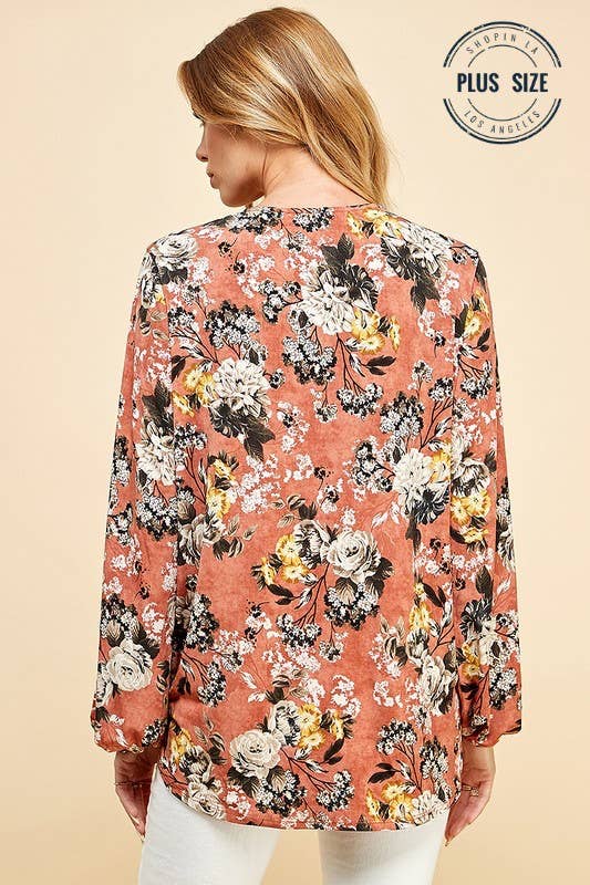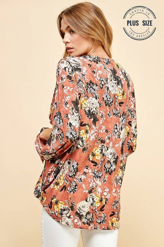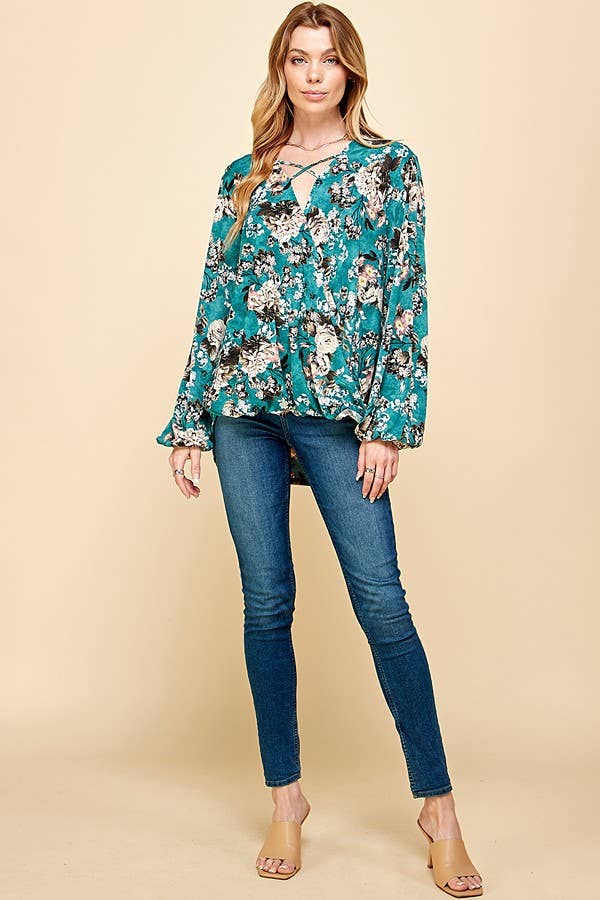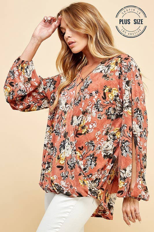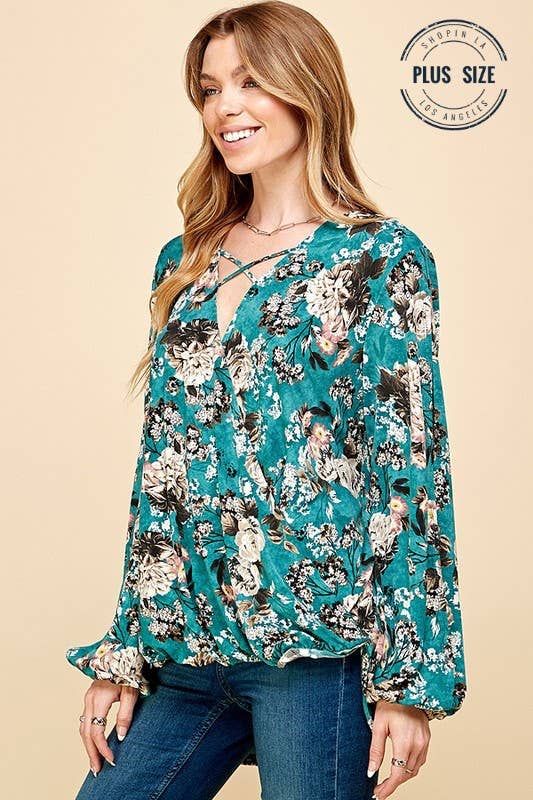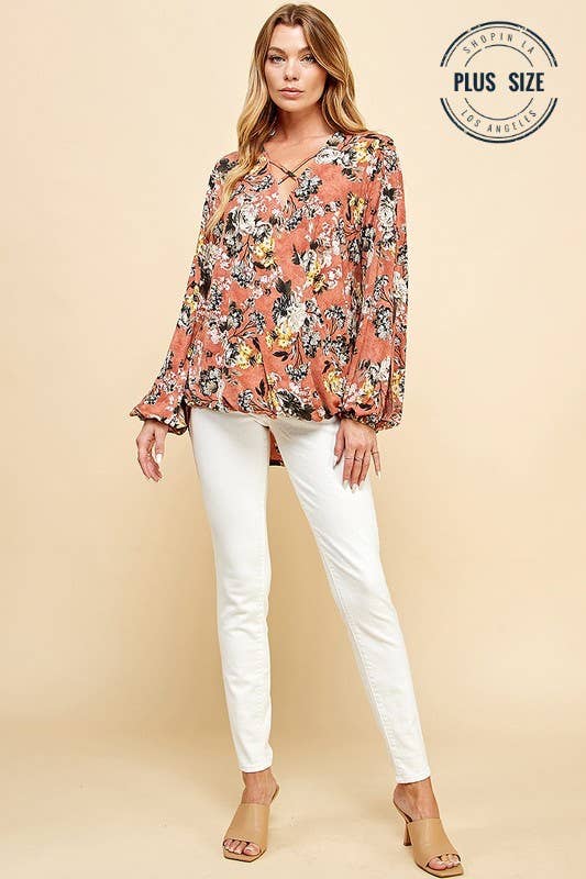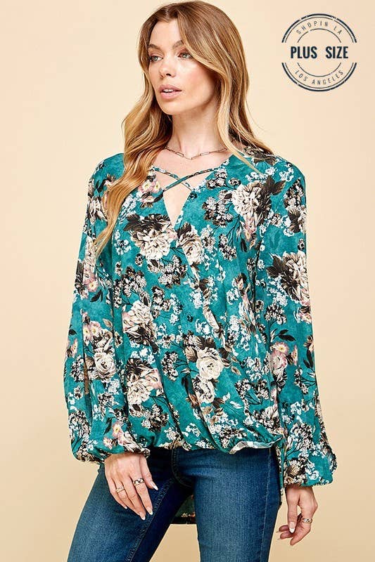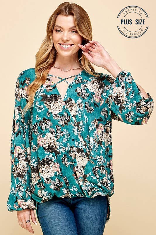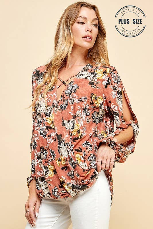 INTRODUCING OUR PLUS SIZE FLORAL CRISS CROSS CUFFED OPEN SLEEVE TOP, A STYLISH AND FEMININE CHOICE FOR ANY OCCASION.
