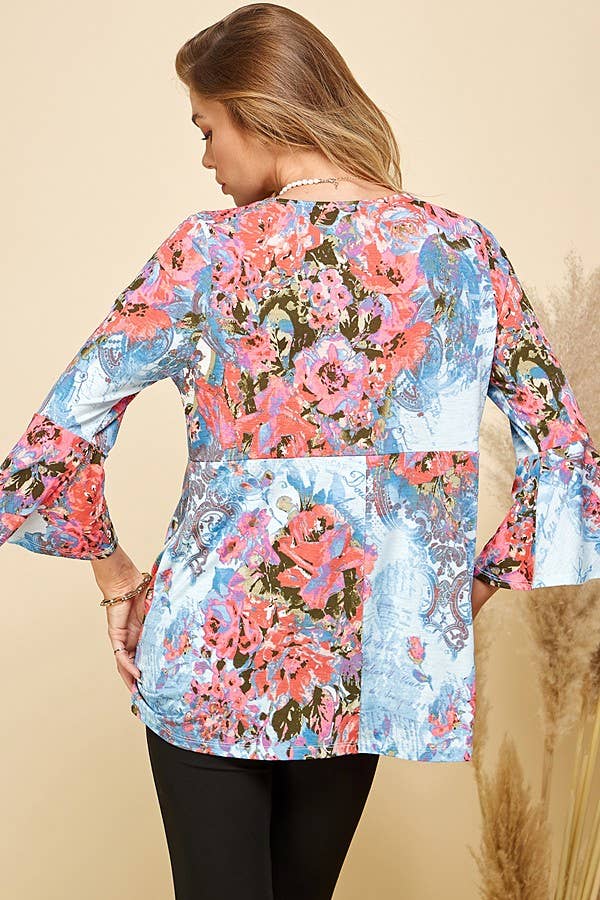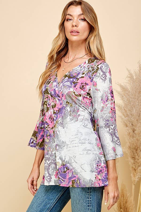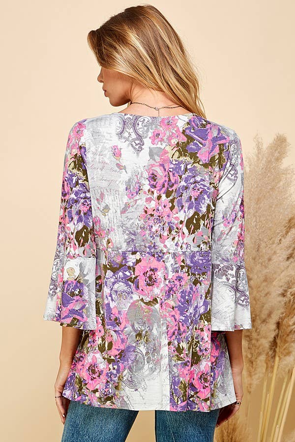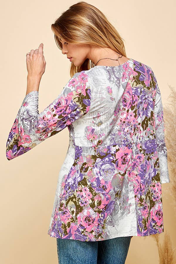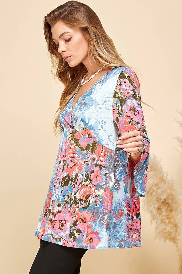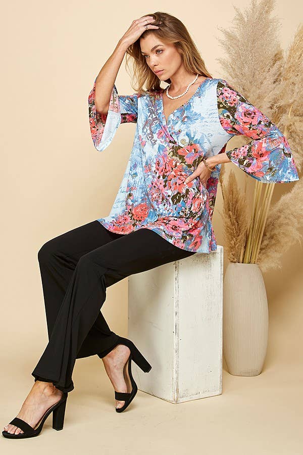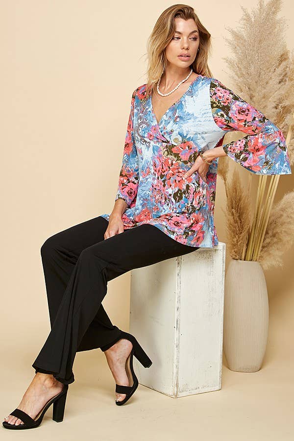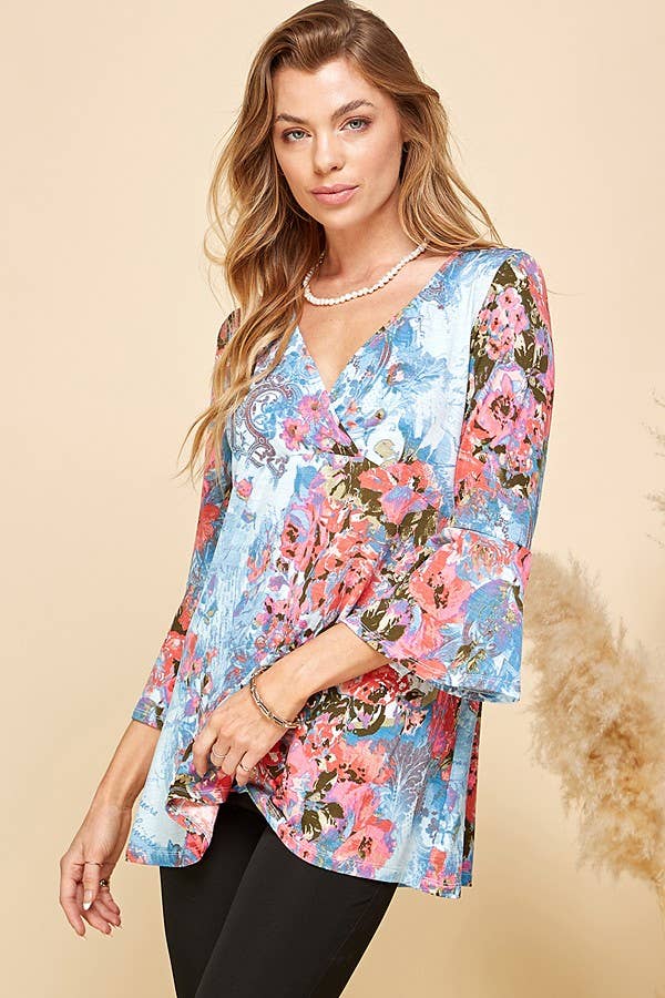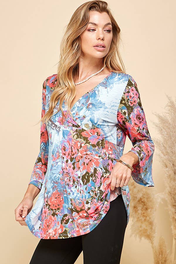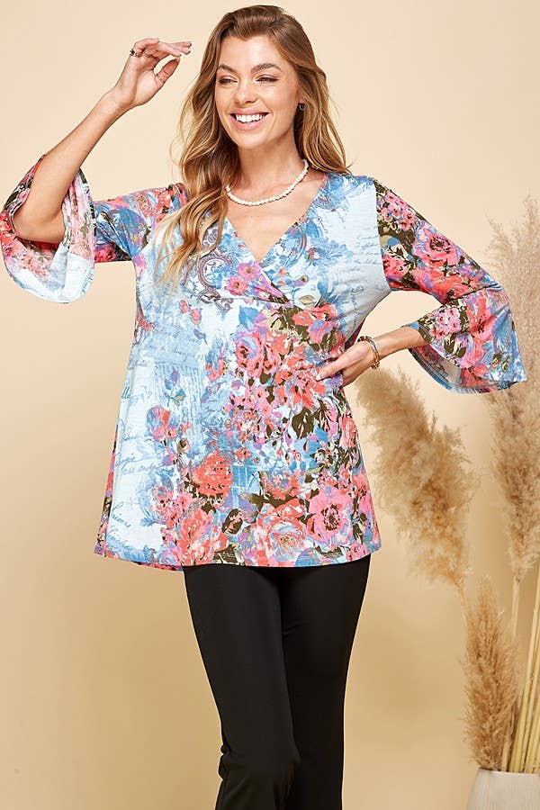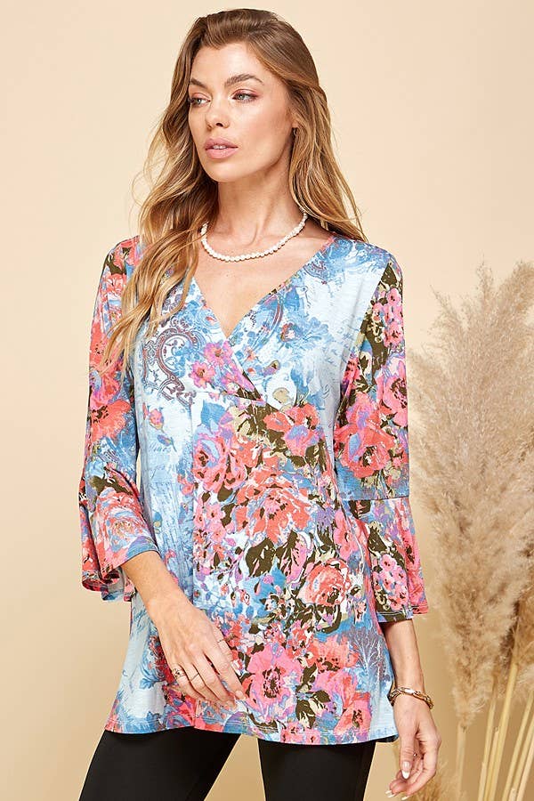 THIS TOP FEATURES A BEAUTIFUL FLORAL PRINT, OFFERING A VIBRANT AND EYE-CATCHING DESIGN. THE 3/4 SLEEVES PROVIDE A FLATTERING AND VERSATILE LENGTH, SUITABLE FOR BOTH TRANSITIONAL AND WARMER SEASONS. THE TUNIC LENGTH OFFERS A RELAXED AND FLOWY SILHOUETTE, MAKING IT FLATTERING FOR VARIOUS BODY TYPES.