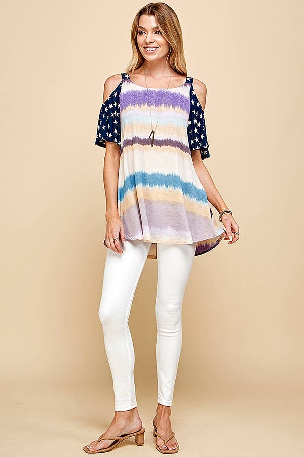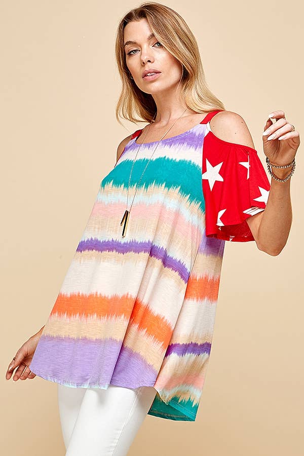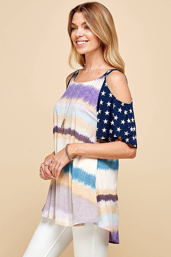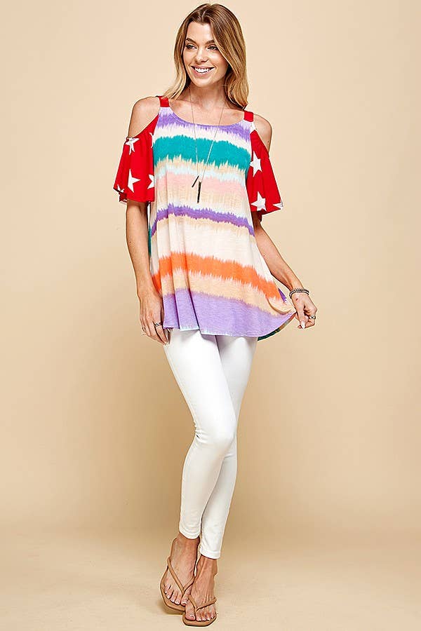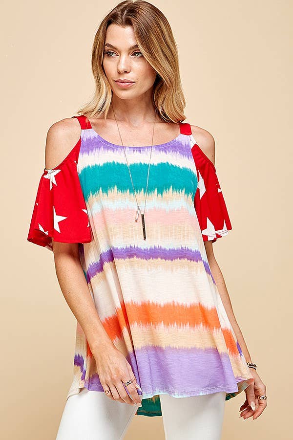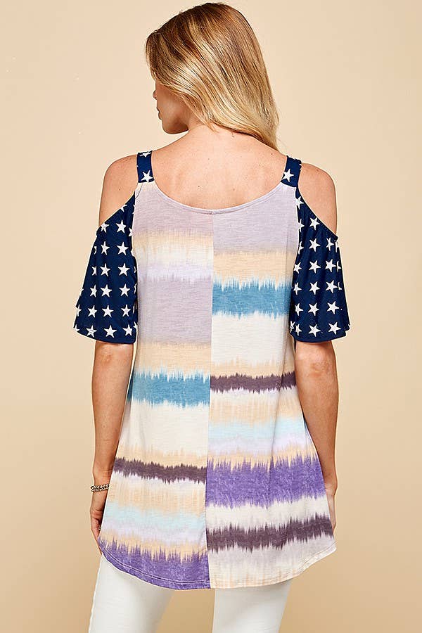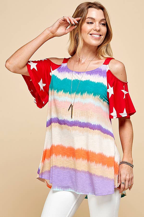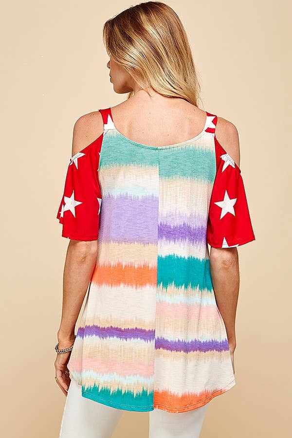 INTRODUCING OUR WOMEN'S COLOR BLOCK COLD SHOULDER TOP WITH STAR PATTERNED SHORT SLEEVE. THIS STYLISH TOP COMBINES THE TRENDY ELEMENTS OF COLOR BLOCKING AND STAR PATTERNS ON THE SHORT SLEEVES.