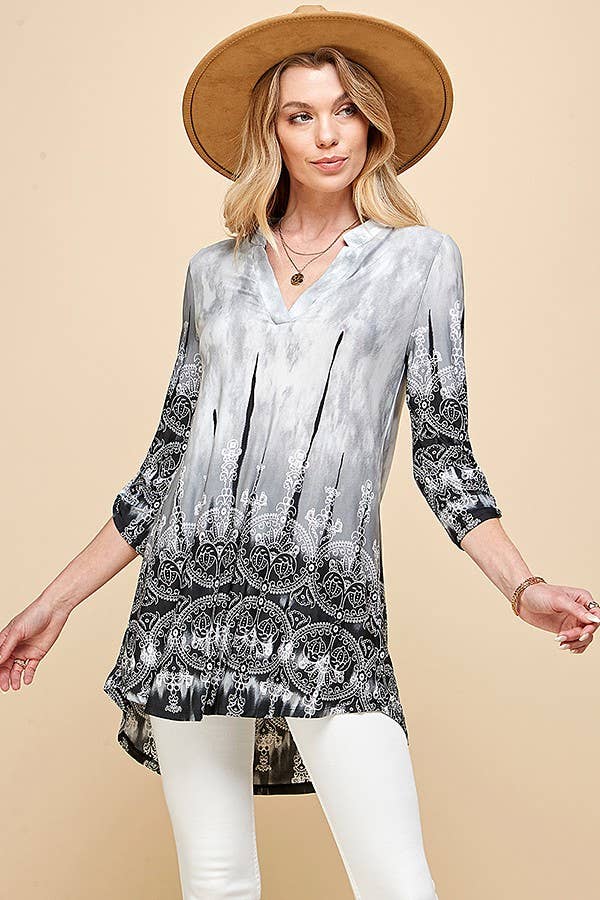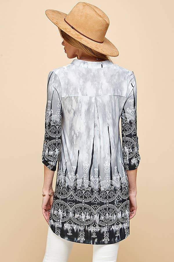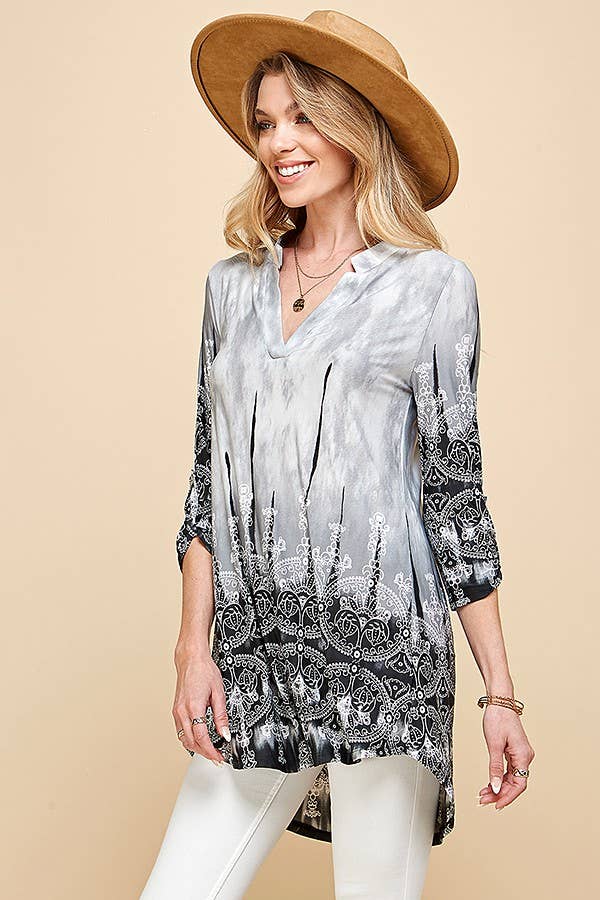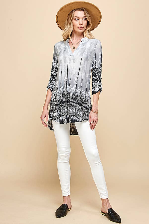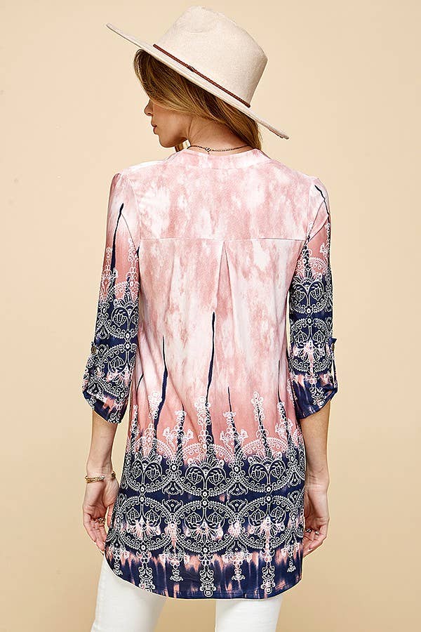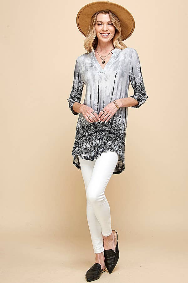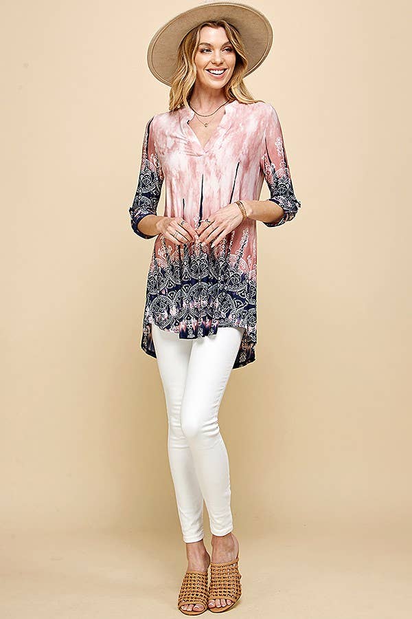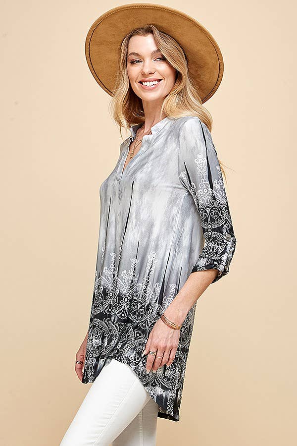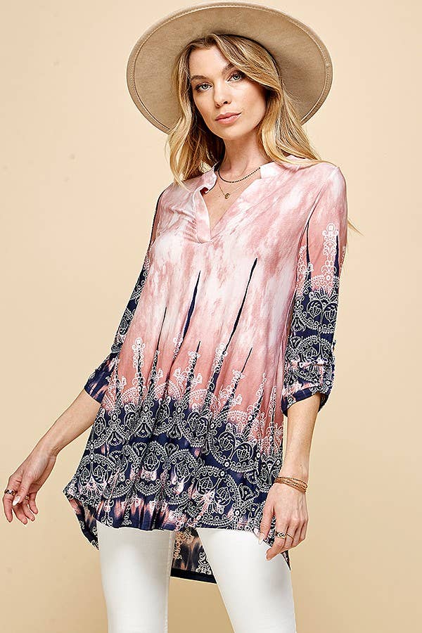 THE PAISLEY PATTERN ADDS A TOUCH OF ELEGANCE AND SOPHISTICATION TO THE TUNIC, WHILE THE TIE-DYE EFFECT BRINGS A MODERN AND VIBRANT TWIST. THE BAND COLLAR NECKLINE ADDS A POLISHED AND REFINED TOUCH, ENHANCING THE OVERALL DESIGN OF THE TUNIC. THE ROLL-UP SLEEVES OFFER VERSATILITY, ALLOWING YOU TO ADJUST THE SLEEVE LENGTH ACCORDING TO YOUR PREFERENCE AND THE WEATHER. THE TUNIC HAS A RELAXED FIT, PROVIDING COMFORT AND EASE OF MOVEMENT. ITS LONGER LENGTH MAKES IT SUITABLE TO BE WORN WITH LEGGINGS OR JEANS FOR A CASUAL AND LAID-BACK OUTFIT.