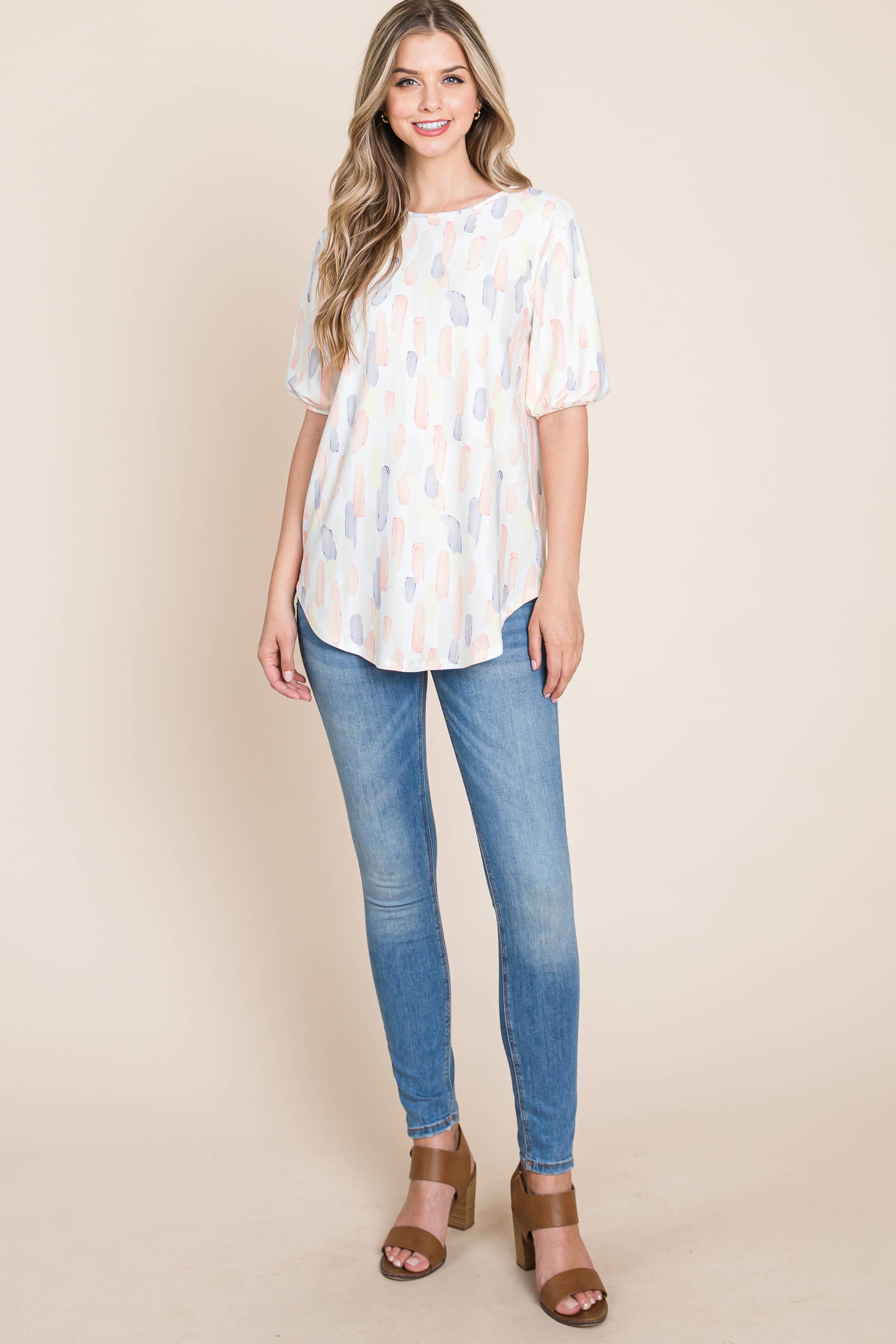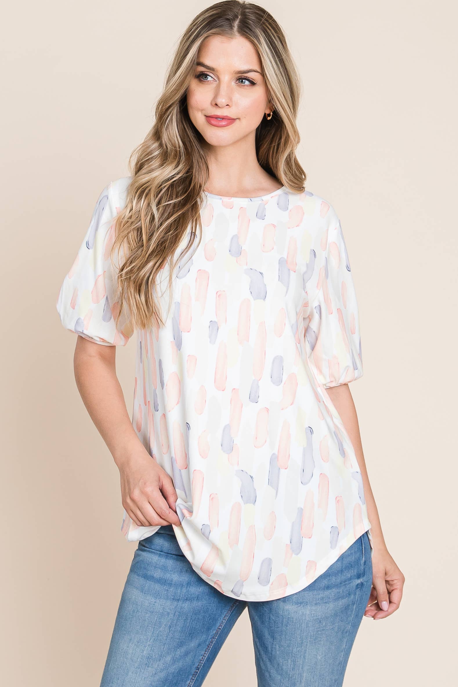 Add a playful pop to your wardrobe with this charming puff sleeve top! Featuring a soft brushstroke print in dreamy pastels, this relaxed-fit beauty is made for comfort without compromising style. The lightweight fabric and round neckline make it perfect for warmer daysโor layering under your fave cardigan when the breeze kicks in. โ๏ธโจ