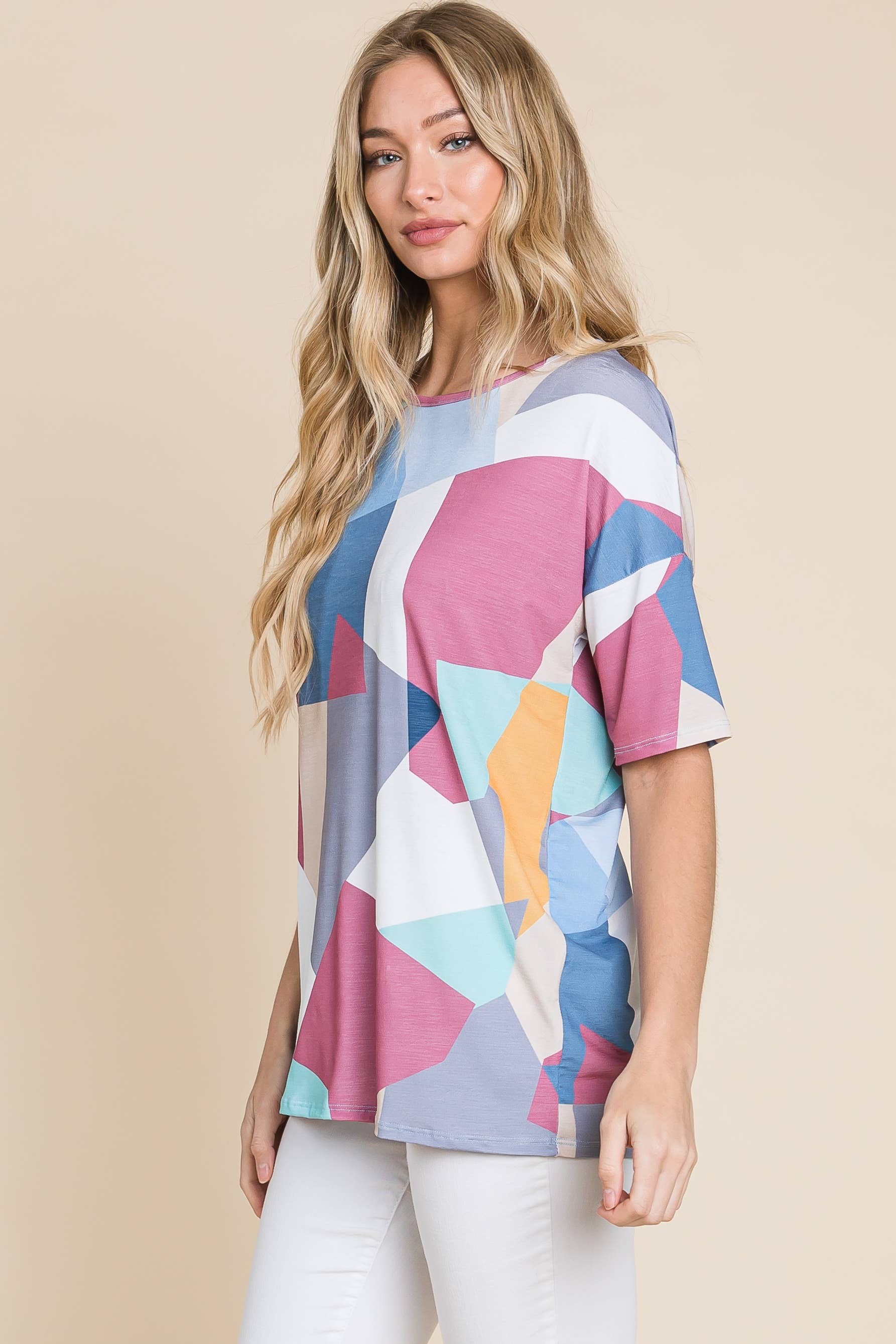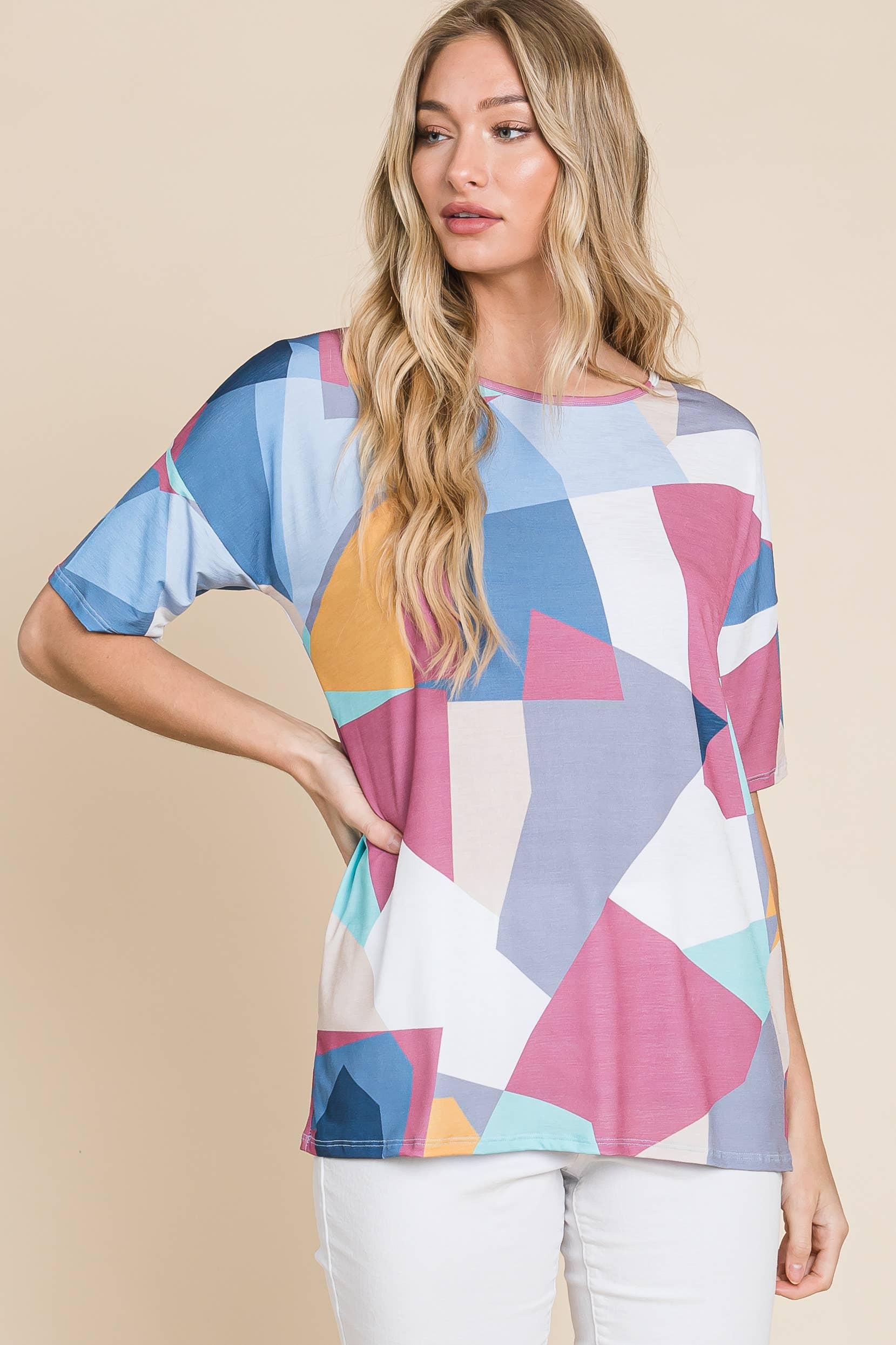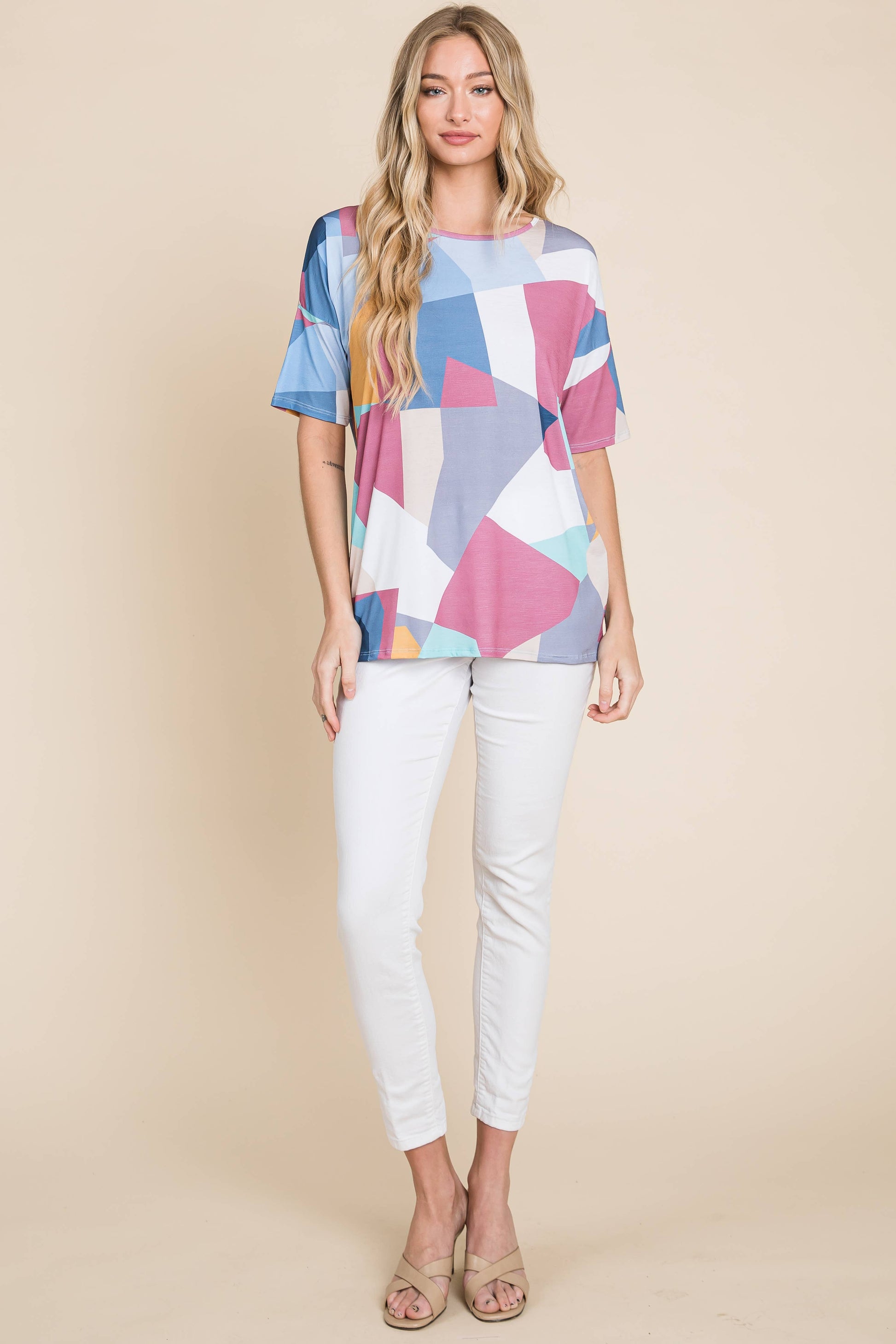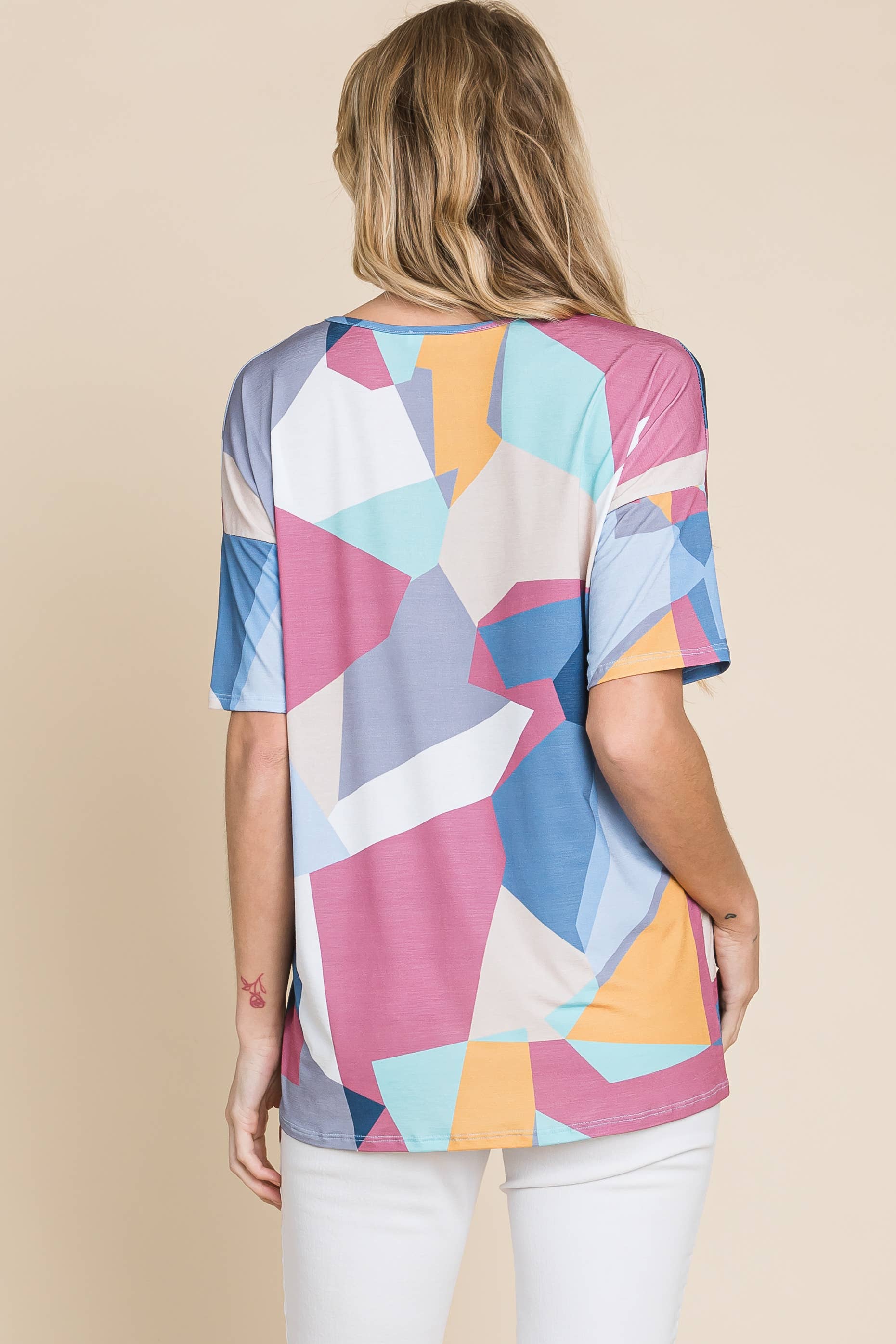 Easy. Breezy. Beautifully bold. This Casual Relaxed Fit Top brings laid-back charm and modern style together in one eye-catching piece. With a mosaic of soft jewel tones and abstract shapes, it's the kind of top that does all the talking—so you don’t have to.