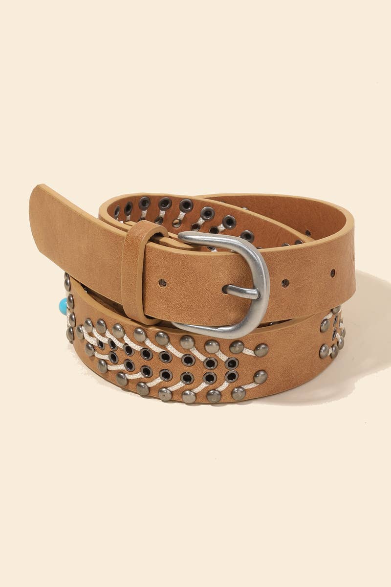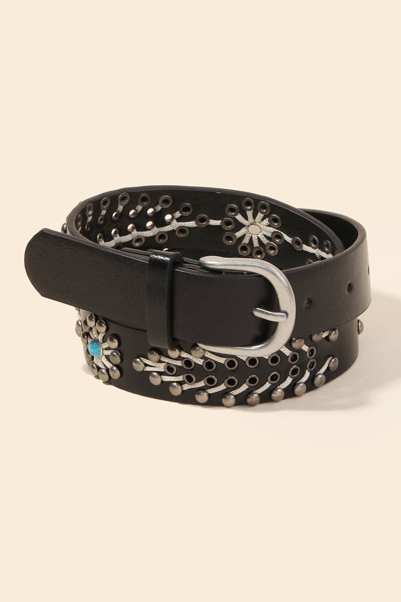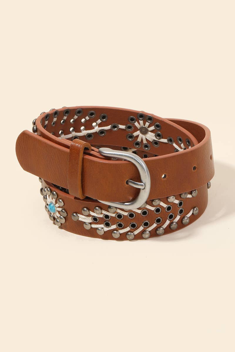 Make a statement, this faux leather belt contains a special western boho design. Discover a new level of fashion versatility as this faux leather belt effortlessly elevates the allure of your attire. Available in BK, BR, CA and IV. This item is sold in packs of 1.