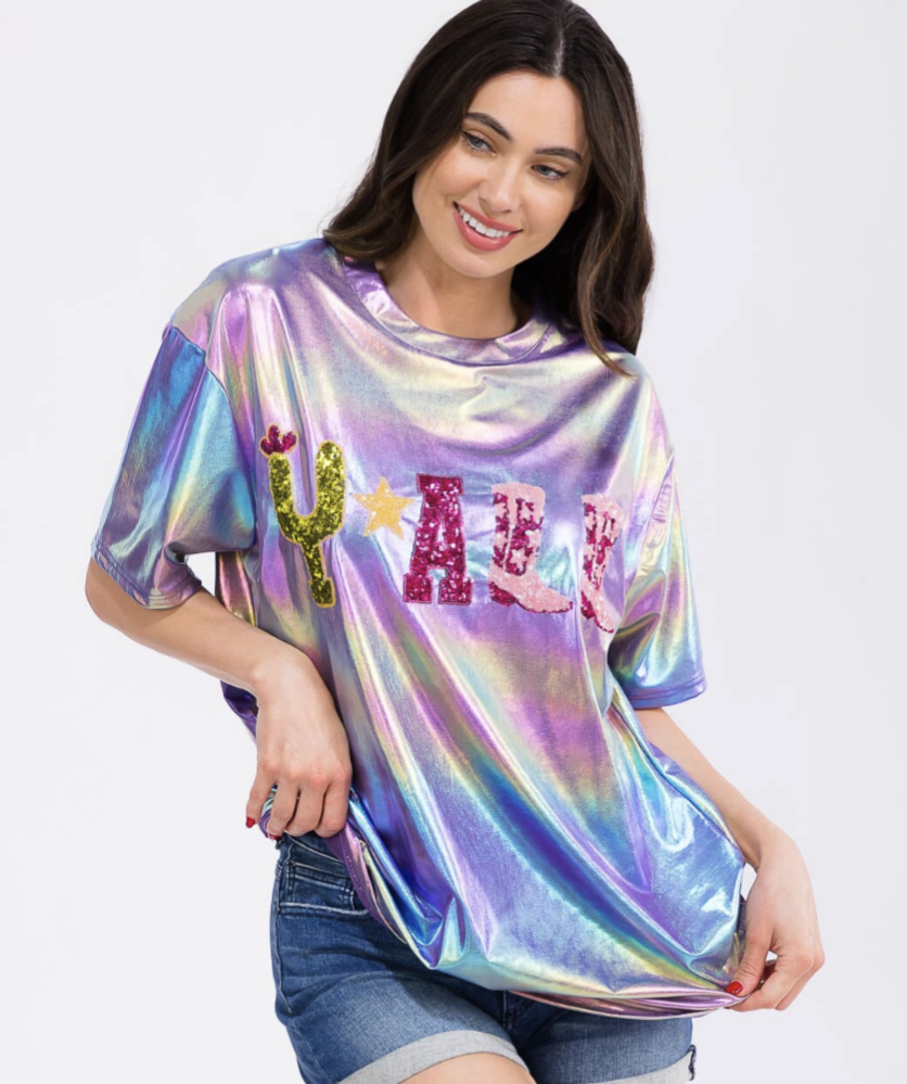 The must-have piece for any trendy boutique, this women's short sleeve metallic tie dye graphic top is a bestseller. The polyester-spandex blend offers a comfortable fit and the metallic tie dye design adds a unique touch, making it a trend-forward layering piece for any season. Whether paired with high-waisted jeans, a blazer and heels, or layered under a cardigan, this top is a versatile and must-have piece for retailers.
